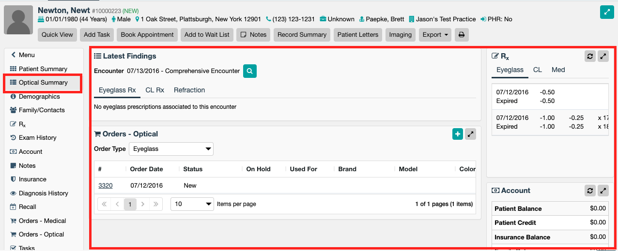 The screen that displays when you access a patient's file can default to either the Patient Summary screen or the Optical Summary screen. This setting is for all patients' files.