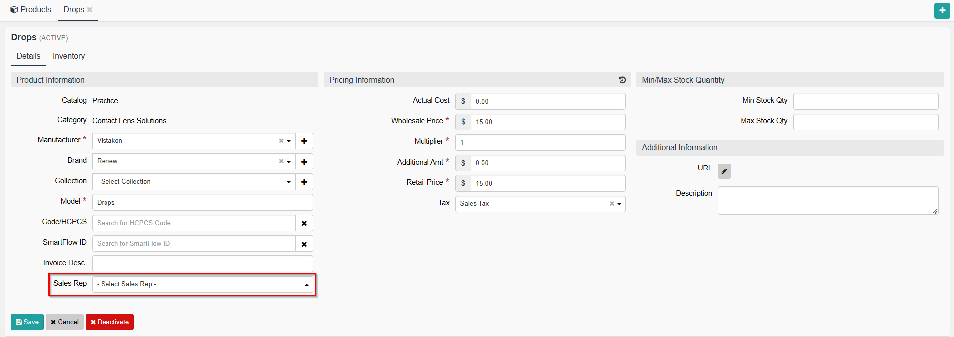 The Sales Representative list can be used to assign an external Sales Representative to your inventory products. This information displays within Inventory > Products > open a product > Details. The field for Sales Rep is within Product Information. See Example The following instructions are to deactivate names from the Sales Representative dropdown menu list.