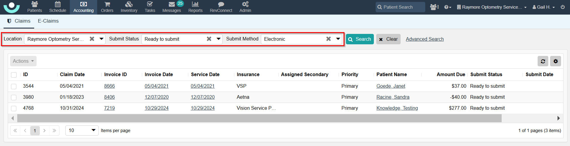 The Claims screen of the Accounting module has filter defaults setup. As you access the Claims screen, your practice location, Ready to submit, and Electronic display in the filter fields. Thus, the claims that match these default parameters display in the grid. See Example To change the claims listed in the grid, adjust the filter fields by editing your selections in the dropdown menus. Additional filter fields are available in Advanced Search.