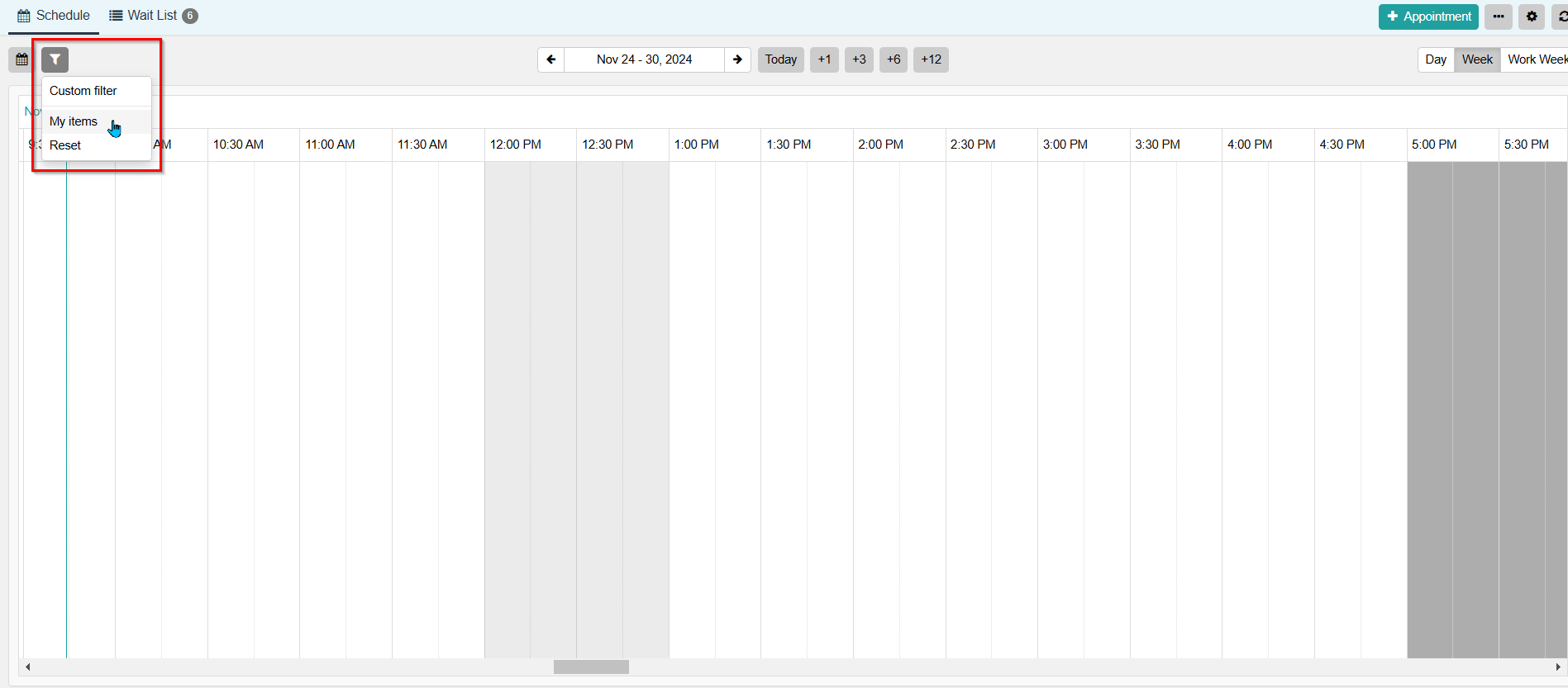 - Select Reset. Note: The Schedule filter settings can be viewed by clicking the Filter icon and select Custom Filter.