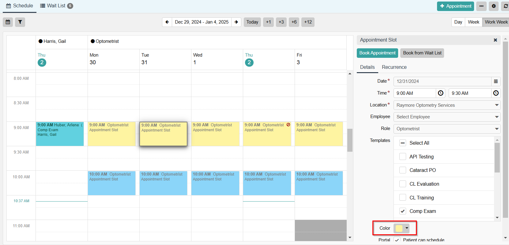 - In the Appointment Slot window that displays, in the Color field, click the dropdown menu arrow. See Example