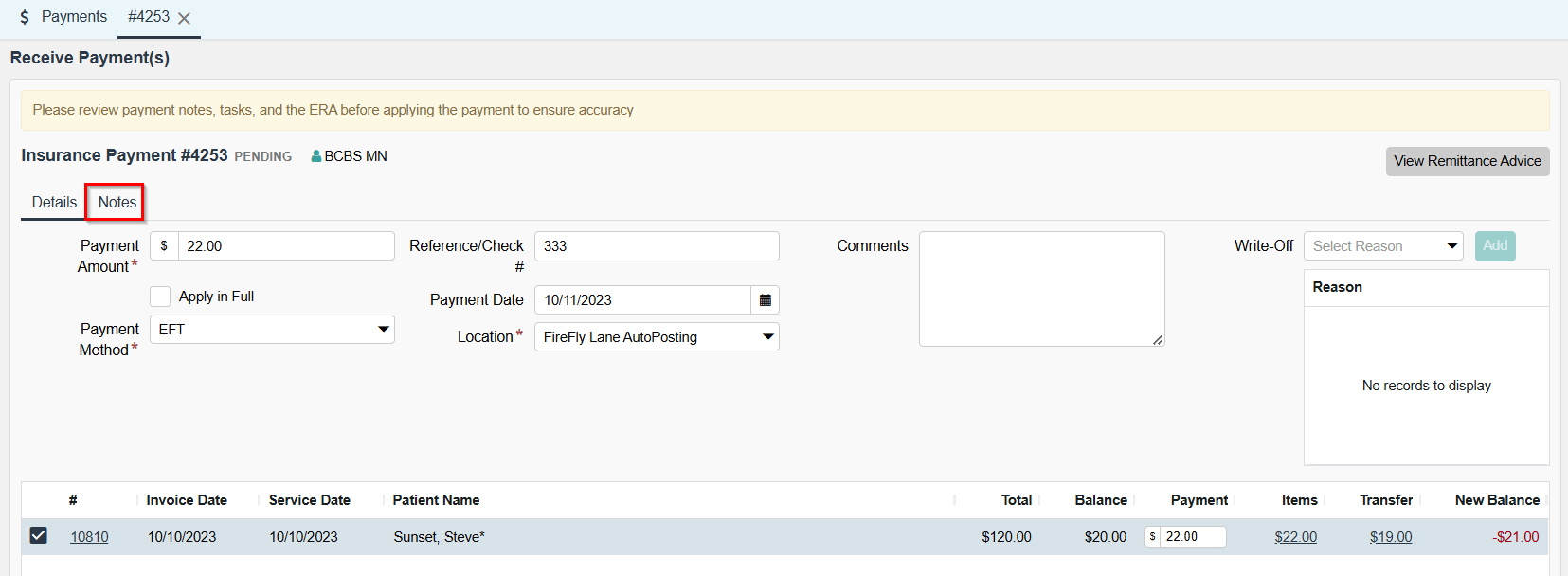 - In the Receive Payments screen, access the Notes tab. See Example