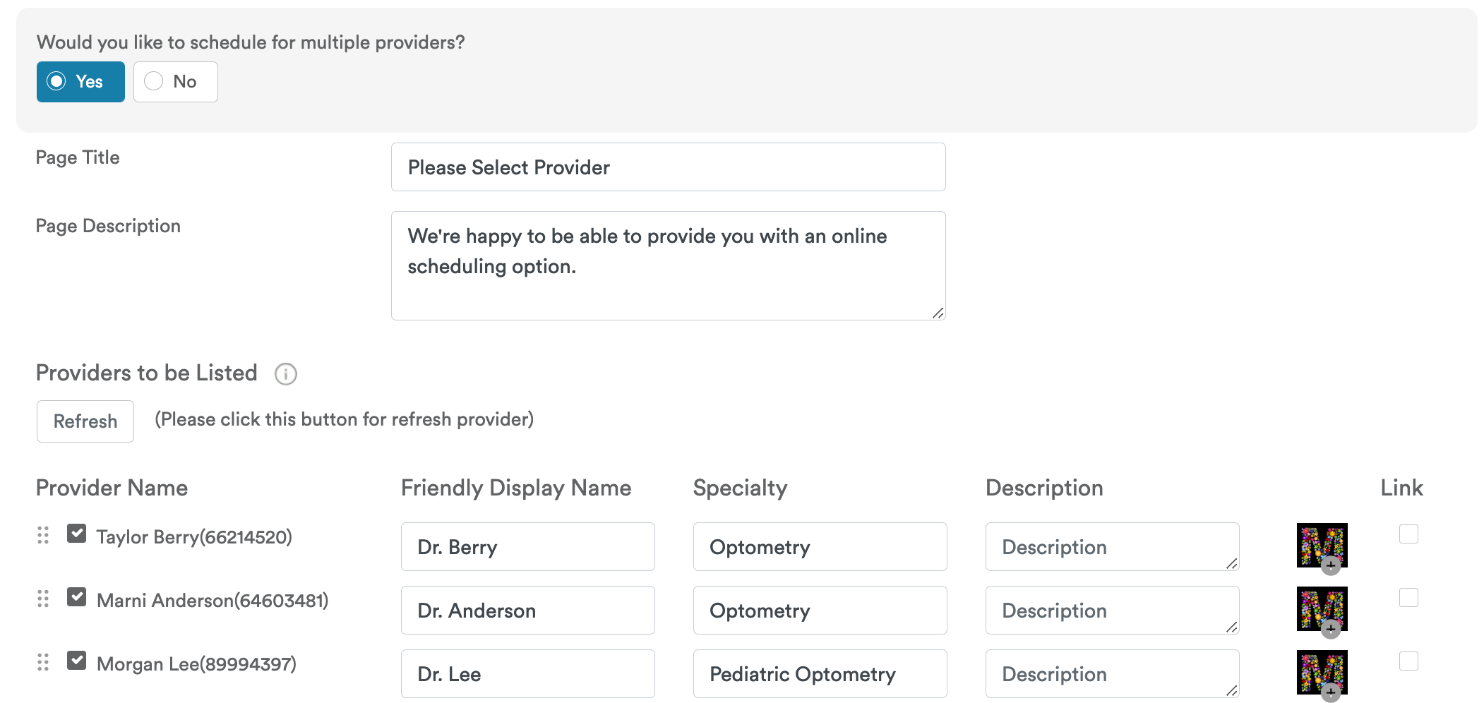 - Select the provider(s) patients will be available to schedule with online. Enter a display name, specialty, description and upload high resolution photos.