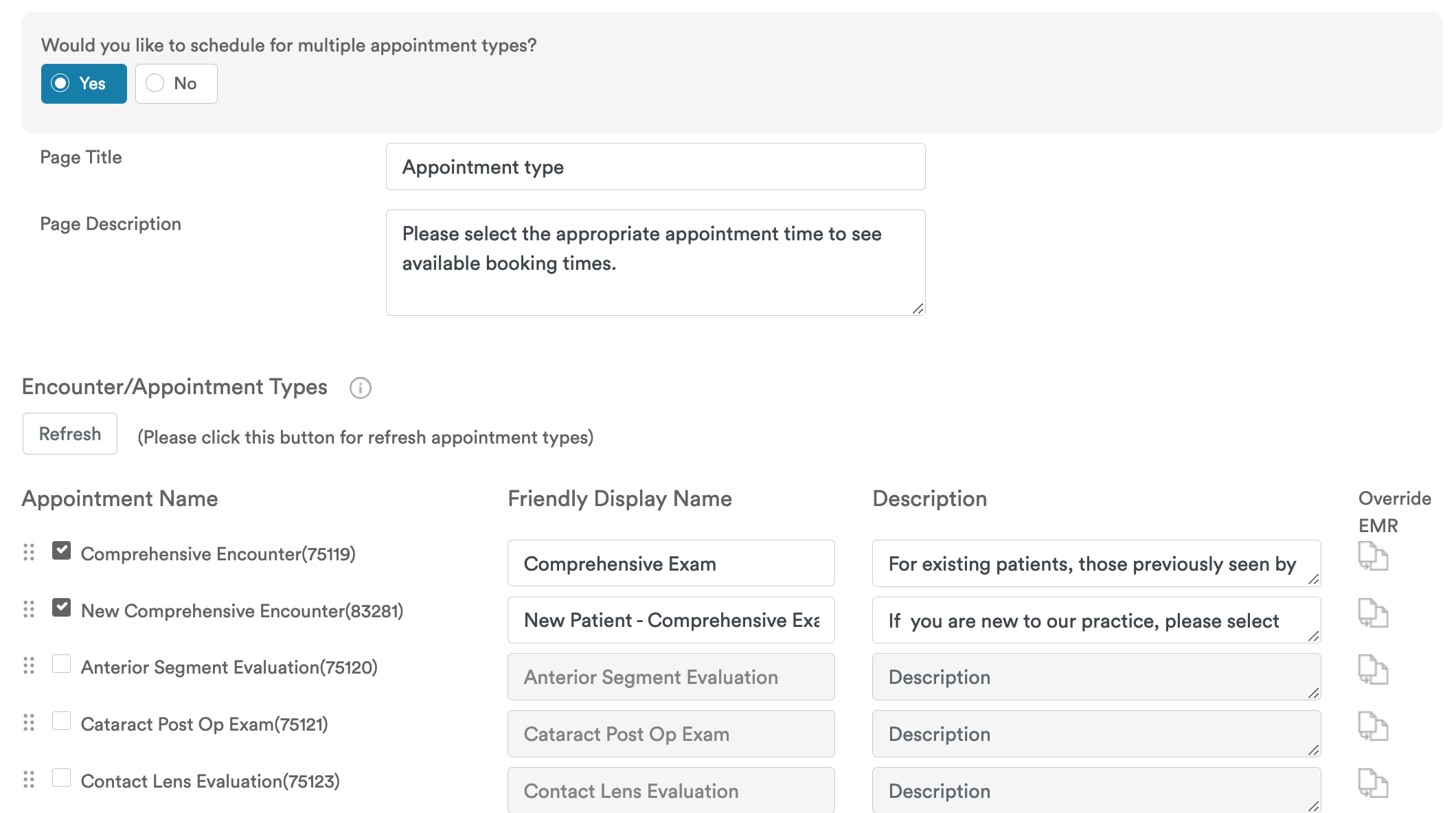 - Select the appointment types patients will be available to book online. Enter a display name, description.