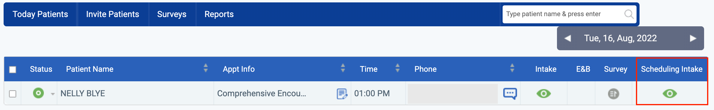 Manage your online scheduling settings by selecting the appointment type(s) and provider(s) to display on your website. Information entered by patients during online booking, including appointment notes and insurance are available on the RevIntake Dashboard > Scheduling Intake column. See Example