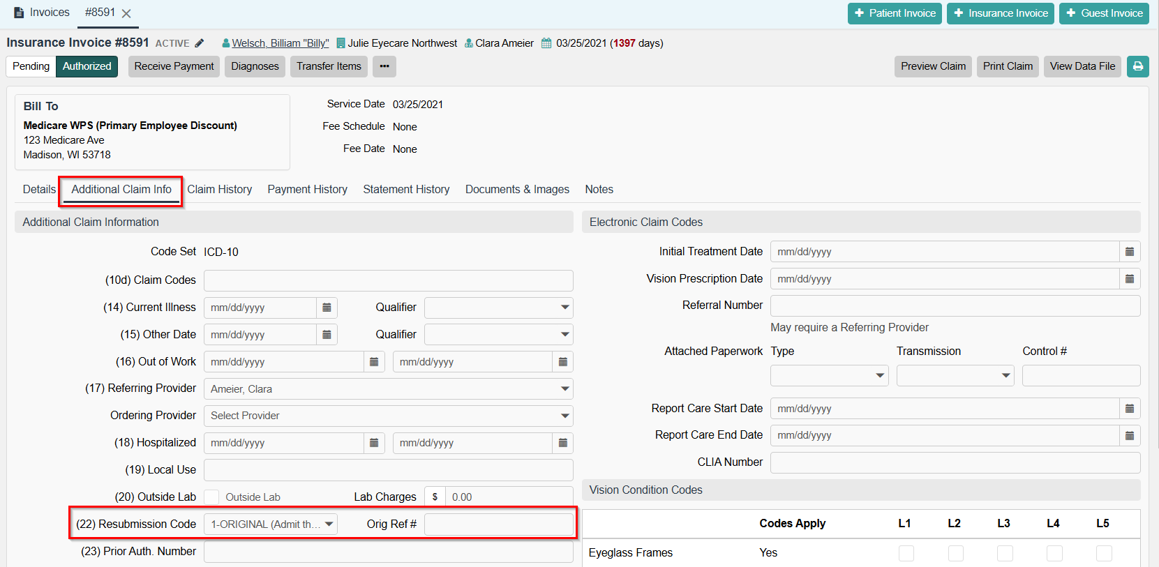 Claim frequency code is also known as Resubmission Code, which is box 22 on the HCFA 1500 form. This field is located on the insurance invoice, within the Additional Claim Info tab, (22) Resubmission Code. For Medicare, the only valid value is '1.' When the Resubmission code is 1, the Orig Ref # field must be blank. See Example