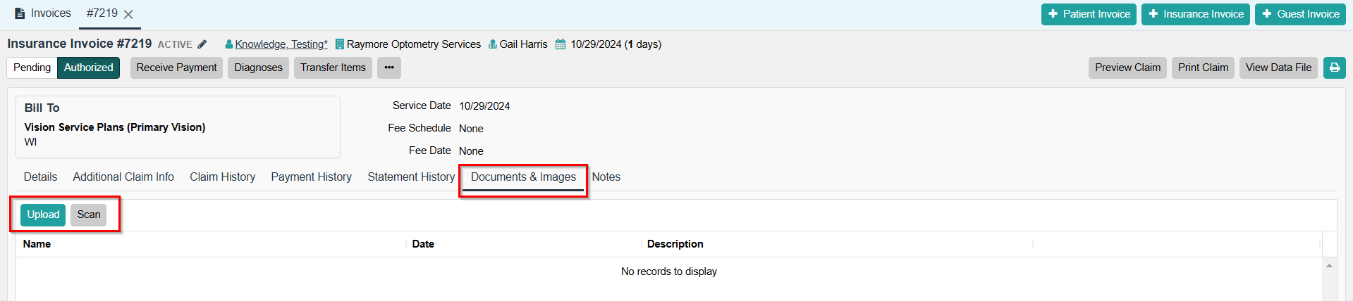 Historical images of a printed claim are not available. If your office wants to save images of printed claims, we recommend you scan the claim and upload the image to the Documents & Images tab within the invoice before mailing. See Example