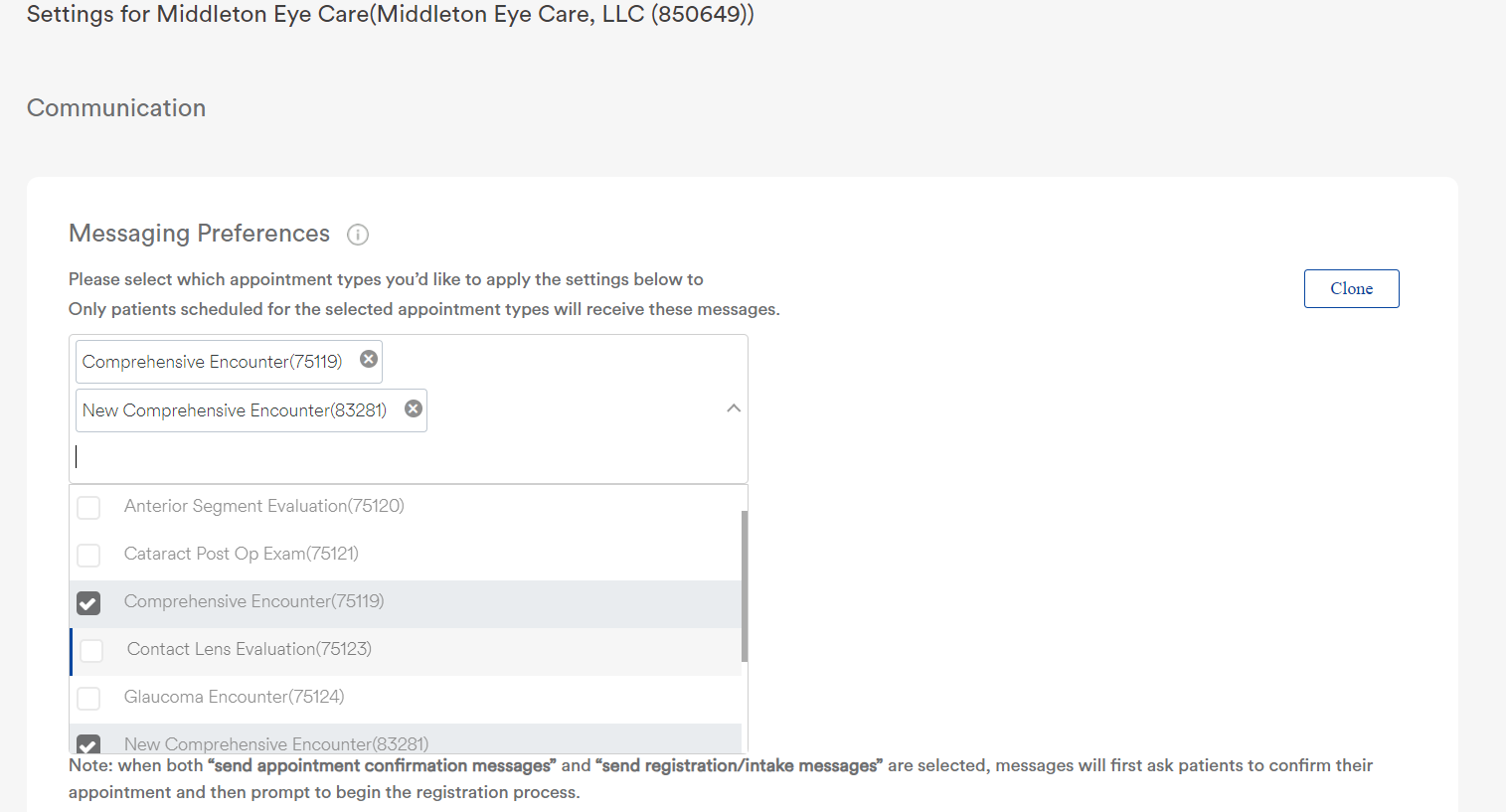 - When both Send appointment confirmation messages and Send registration/intake messages are selected, messages will first ask patients to confirm their appointment and then prompt them to begin the registration process.