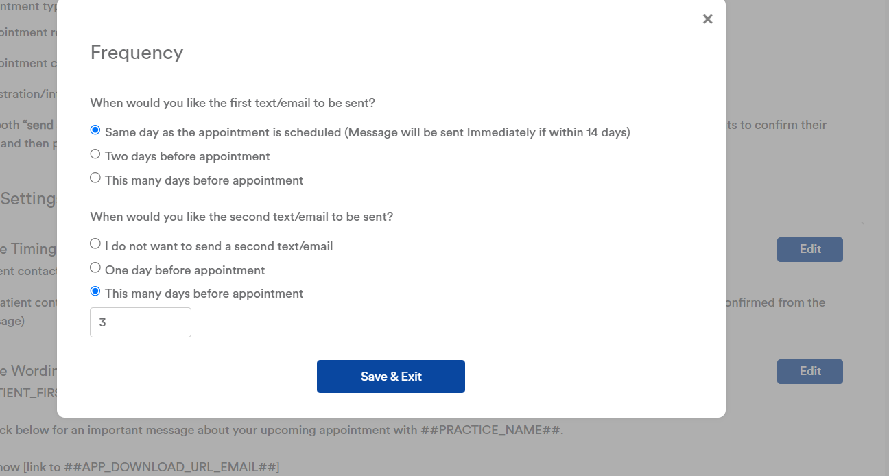 By default, patients receive a reminder message two days before and one day before an appointment. Note: The one-day reminder will only be sent if the patient doesn't complete the actions requested in the reminder sent two days before an appointment. Please review and update the message timing, based on office preference. See Example