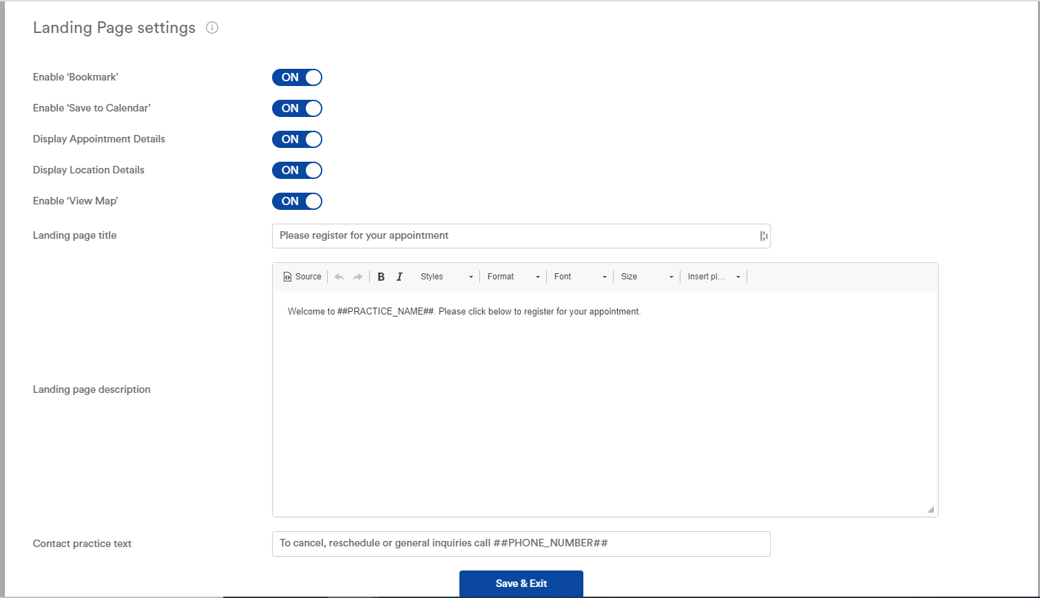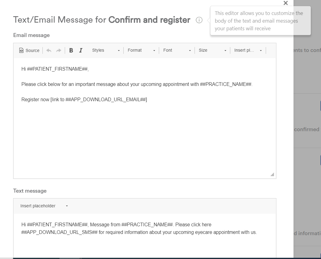 - Send appointment confirmation messages will ask patients to confirm but not complete registration and intake forms.