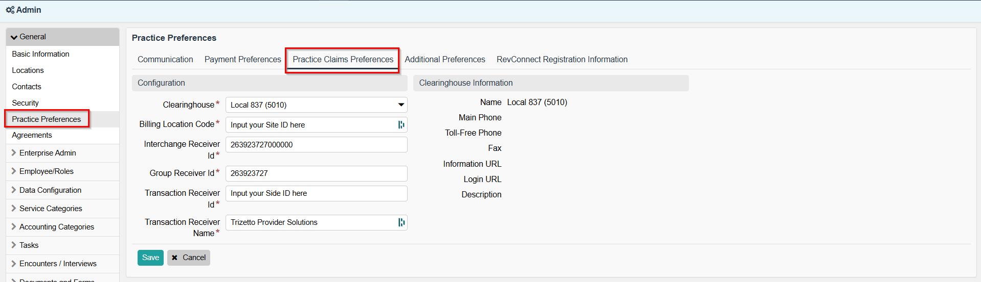 - Access Admin > General > Practice Preferences > Practice Claims Preferences.