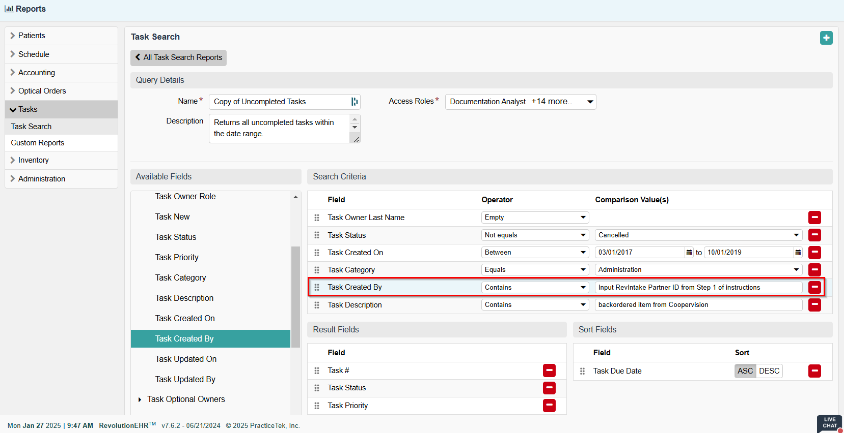 - In the Available Fields section, open Task, drag and drop Task Created By to the Search Criteria section. Note: The information from