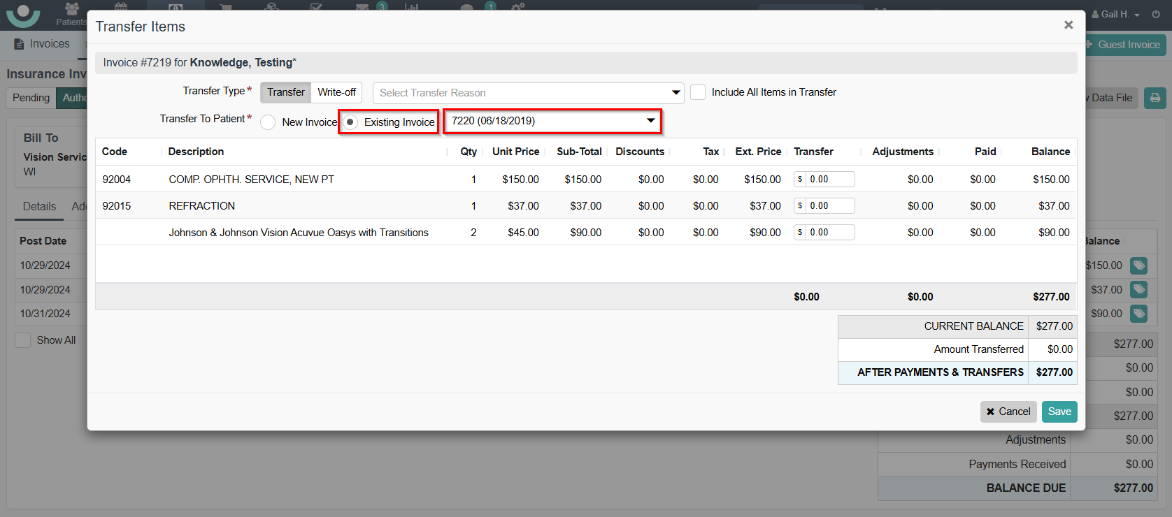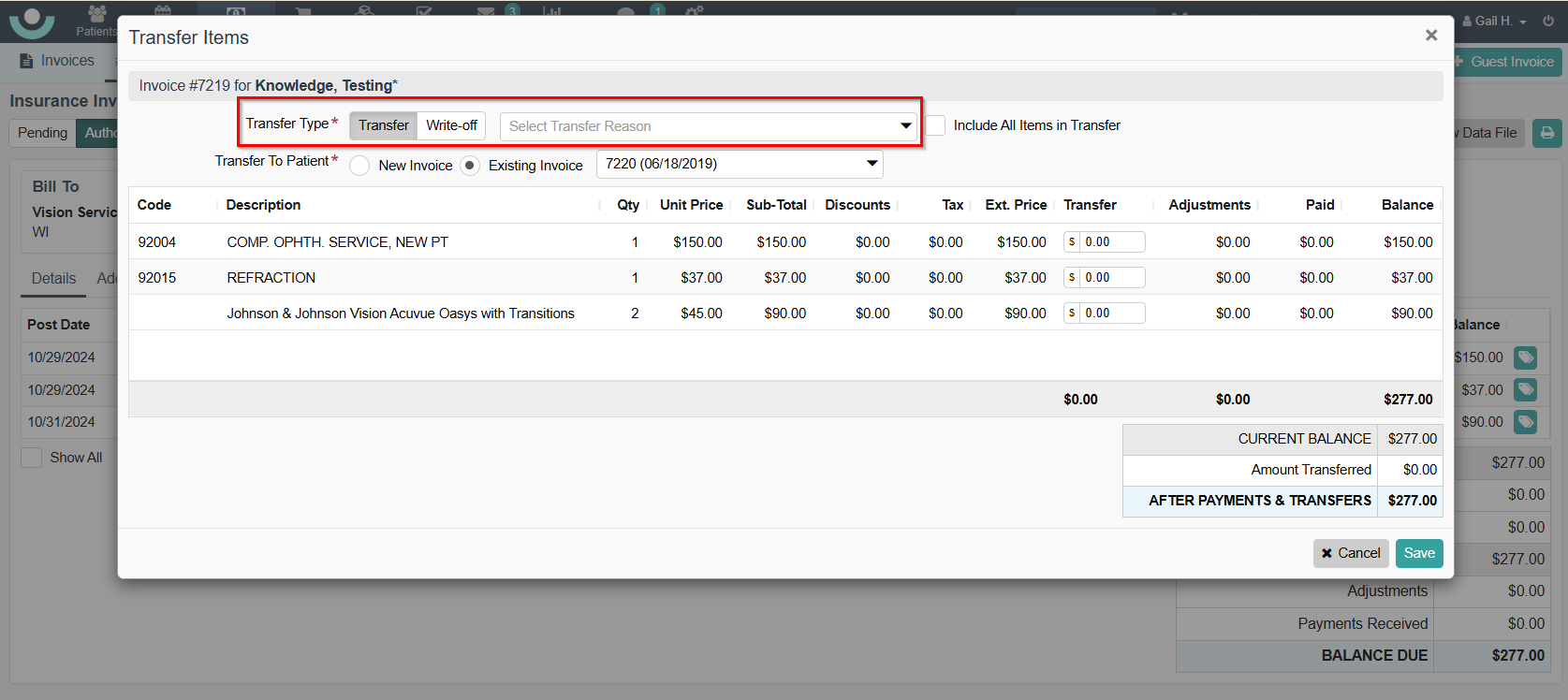 - Click 'Save.' Note: This action creates the transfer to the patient's invoice.