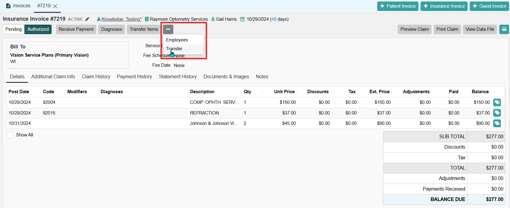 - The insurance invoice includes a line item with a Code of Transfer-out and a Description of Transferring Amount. The Balance column displays the amount from step #4 as a negative.