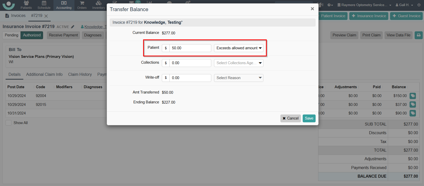 - In the Transfer Balance modal, input the amount in the Patient field, and select a reason from the dropdown menu. See Example