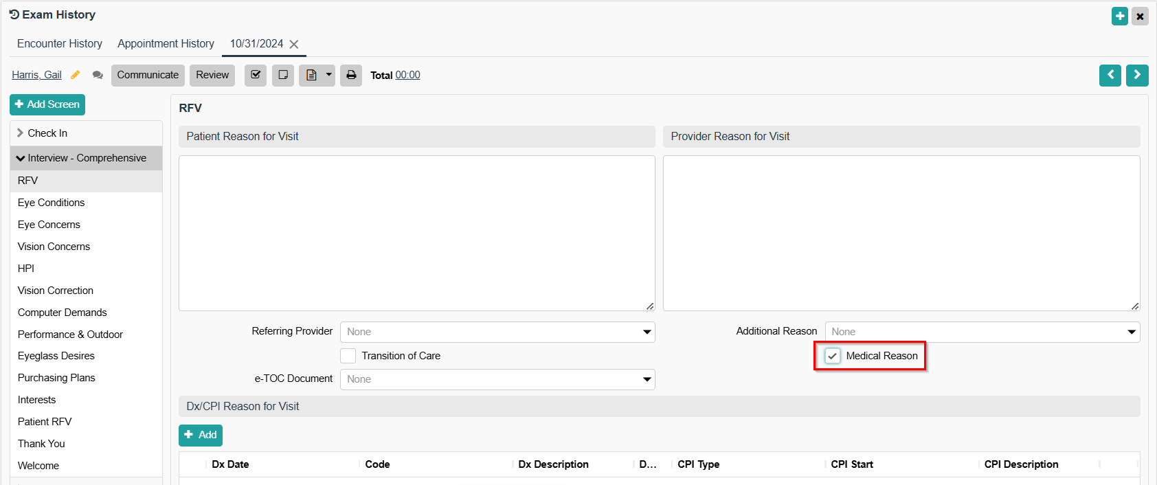 - The Medical Reason box must be checked in the RFV screen. Note: This checkbox is located below the Provider Reason For Visit. See Example
