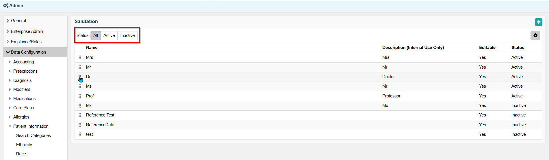 - Access Admin > Data Configuration > > Patient Information > Salutation.