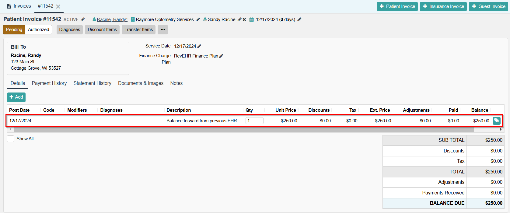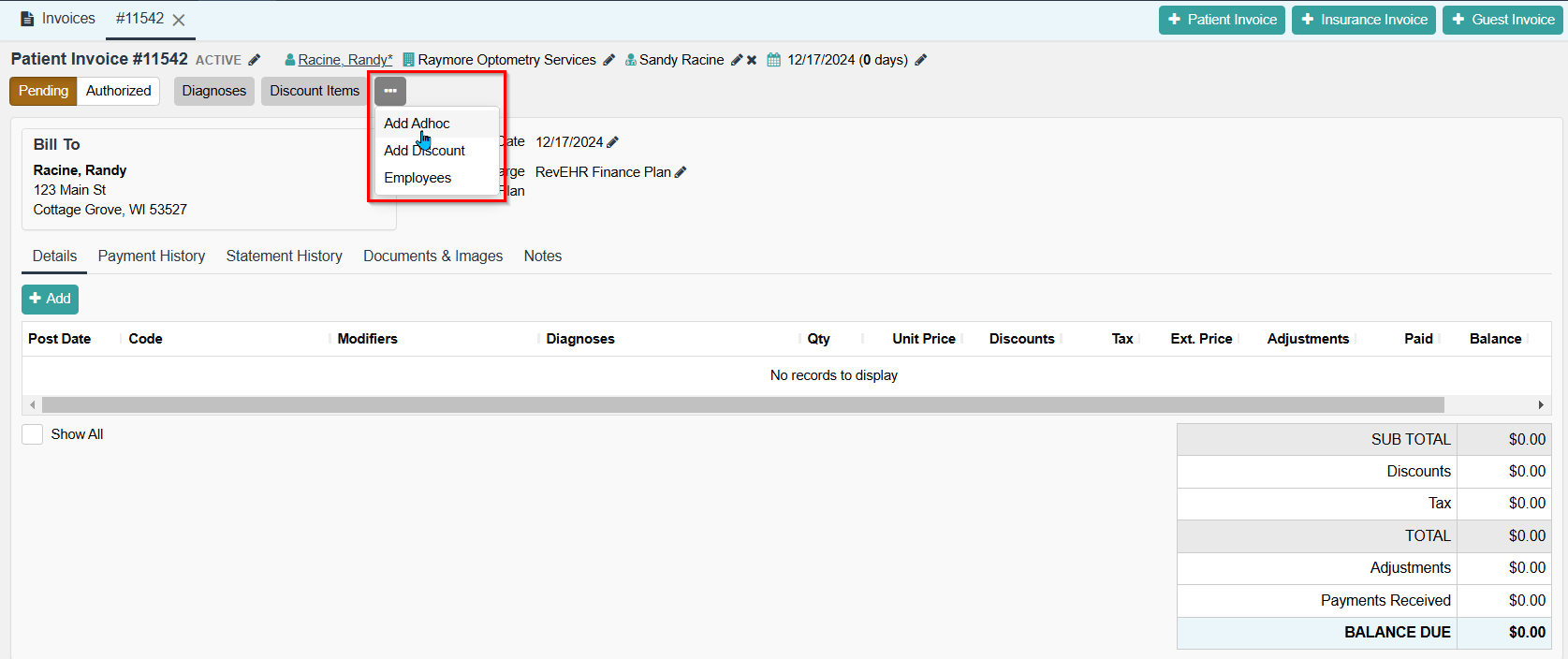 - In the Add Adhoc Item modal, in the Description field, input "Balance Forward From Previous EHR." Note: Each office can input a different message in the Description field, however, our recommendation is be consistent.