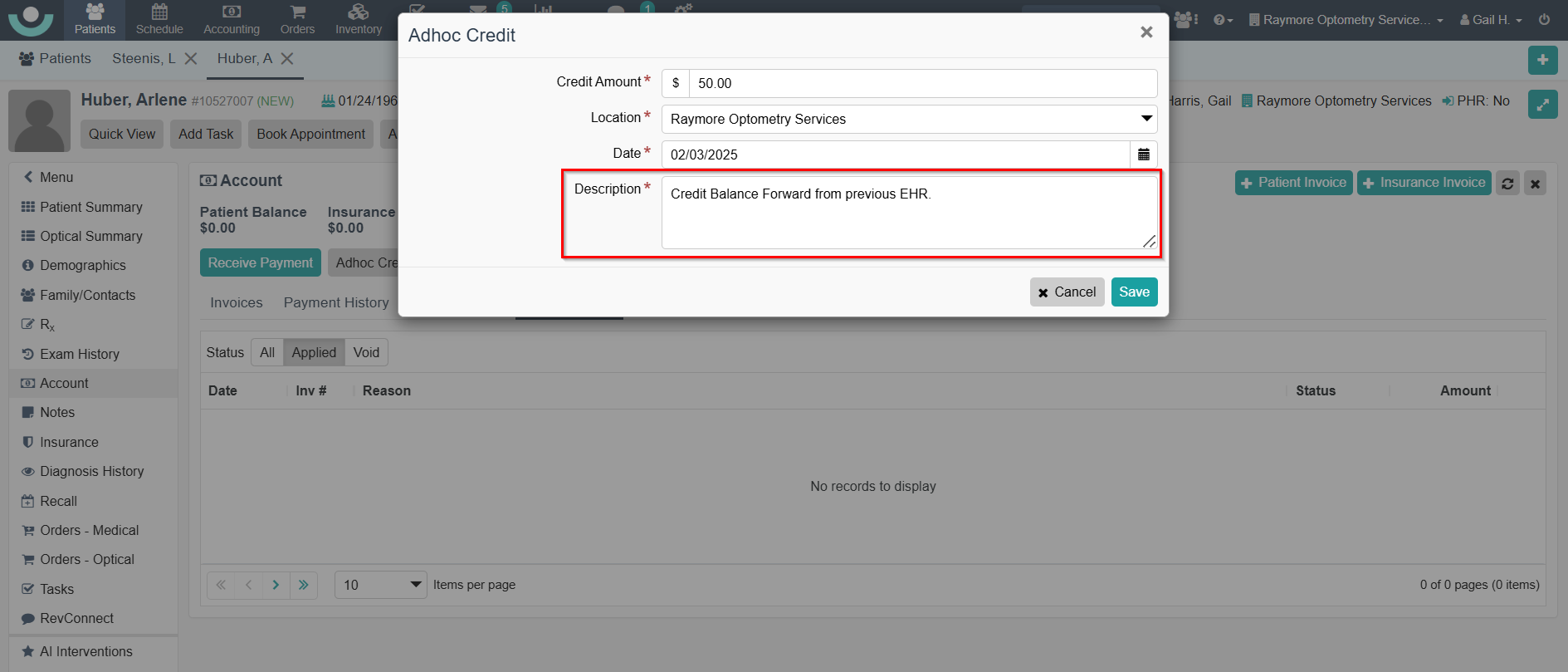 - In the Description field, input "Credit Balance Forward from previous EHR." See Example Note: Your practice can input any text into the Description field, however, it is our recommendation that it is consistent across your practice.