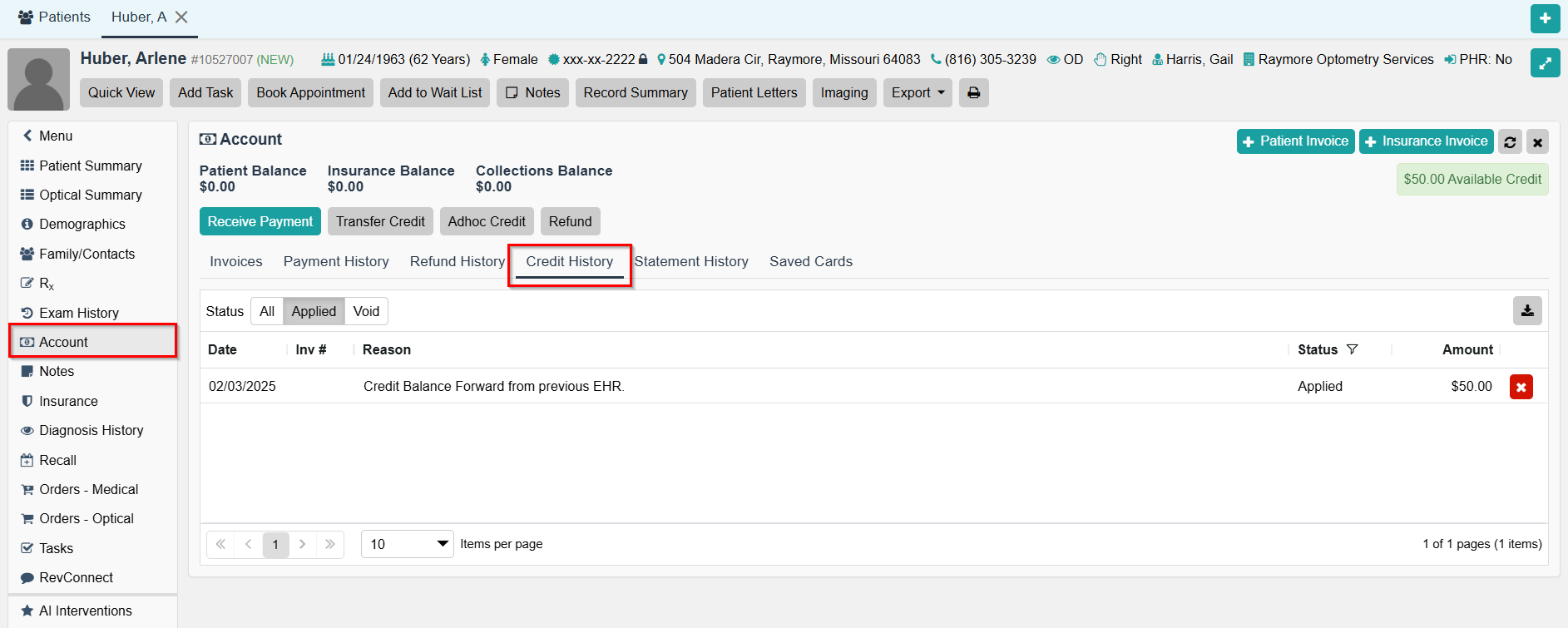 - In the Adhoc Credit modal, in the Credit Amount field, input the patient's credit.