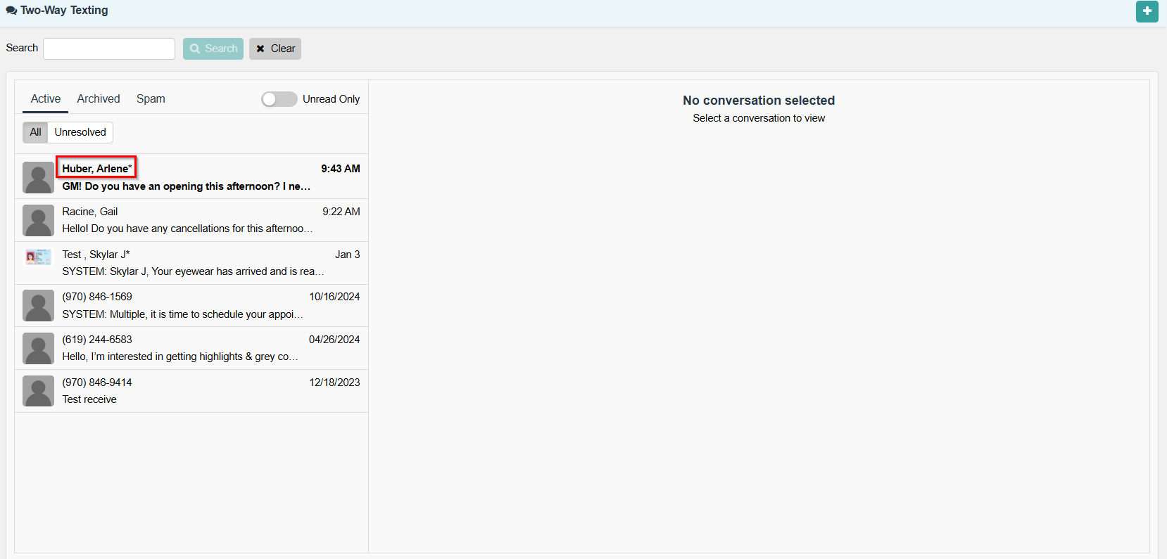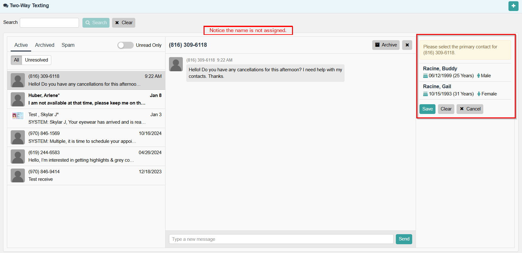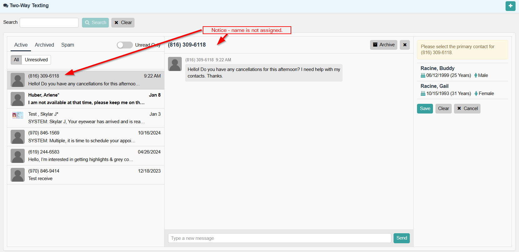 - If an incoming phone number does not match a patient within the practice's database, the system lists it as unknown. The practice has the ability to text with the person, ask their name, and then update their demographics. After demographics is updated, the user can edit the primary contact and the text displays the patient's name.