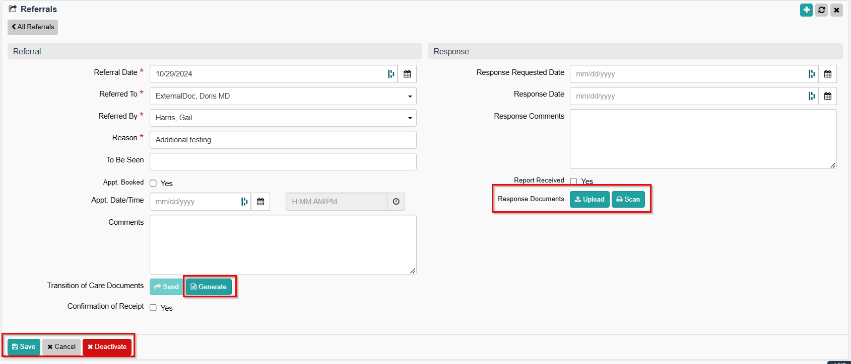 - A field for Response Documents displays with buttons for Upload and Scan.