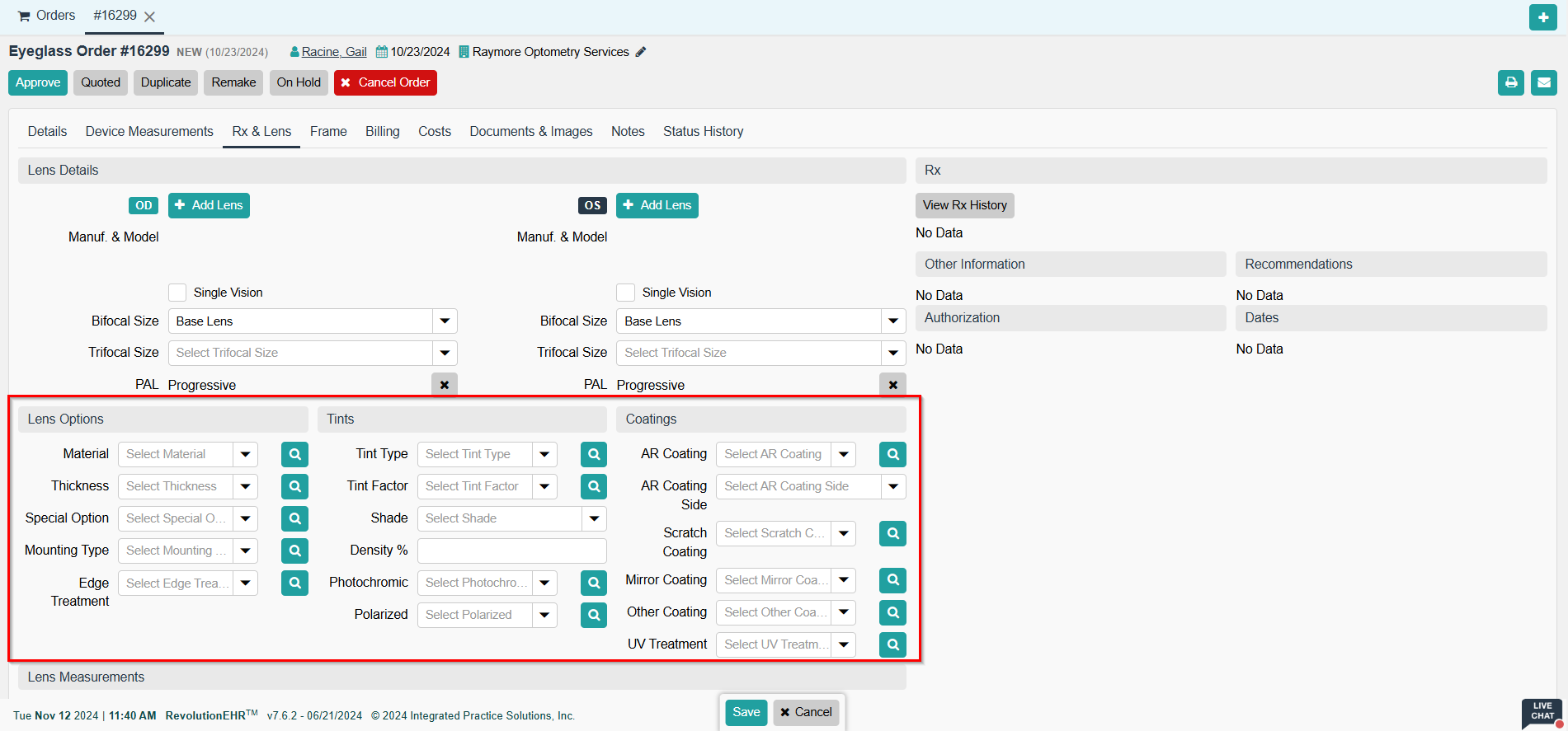 Options cannot be added or removed from the dropdown menus for Lens Options, Tints, and Coatings within an Optical Order. See Example