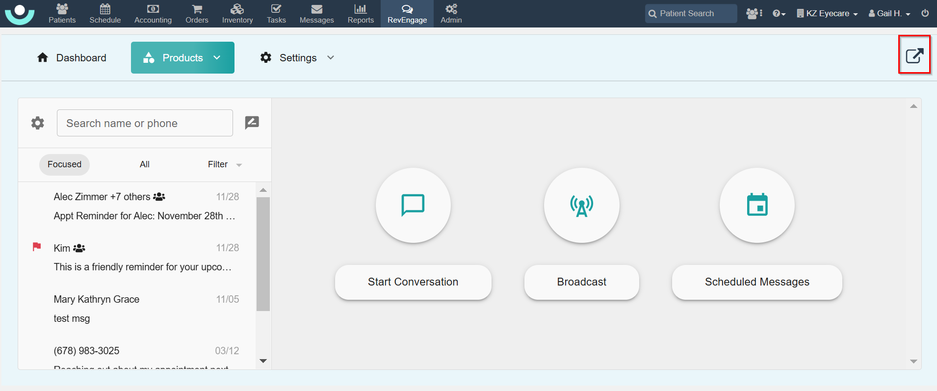 The user can have RevEngage opened within RevolutionEHR and within a separate browser tab at the same time. With a browser tab opened, the user will receive incoming text notifications while still using the other features of RevEngage within RevolutionEHR. The following instructions are to open a new browser tab from within the RevEngage module.