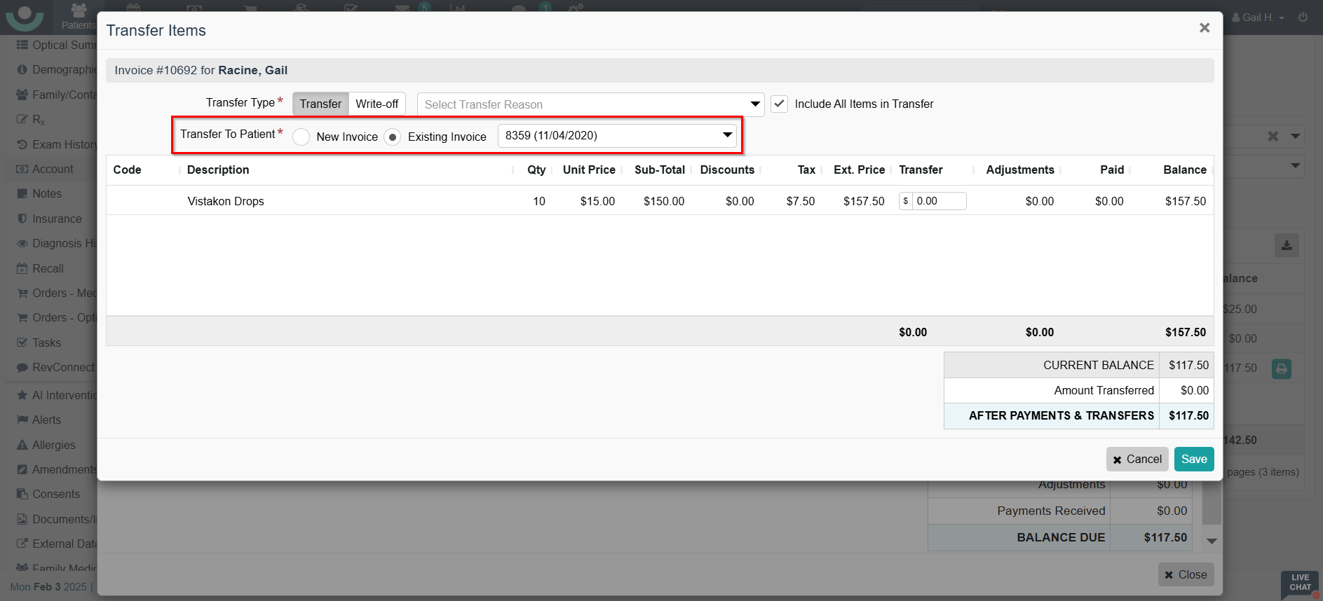 - Existing patient invoices must be in Pending status to receive the transfer.