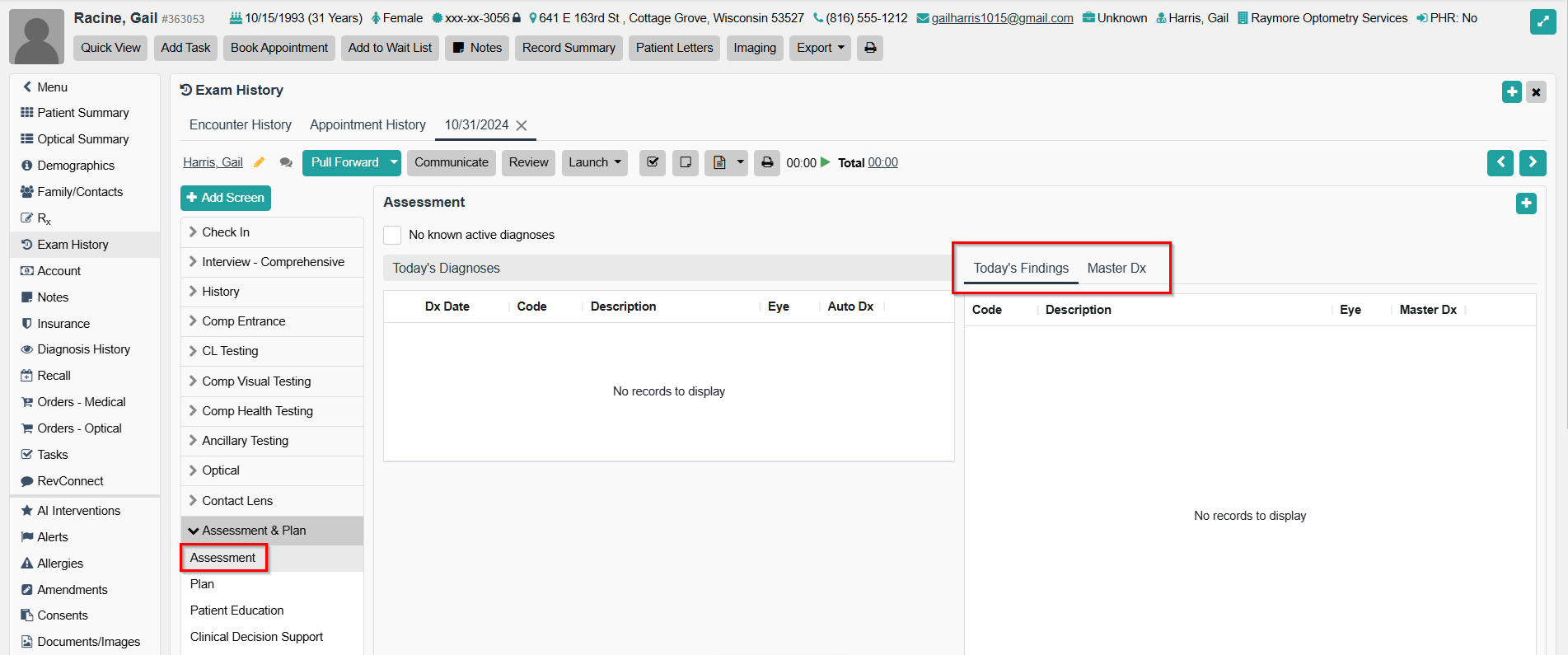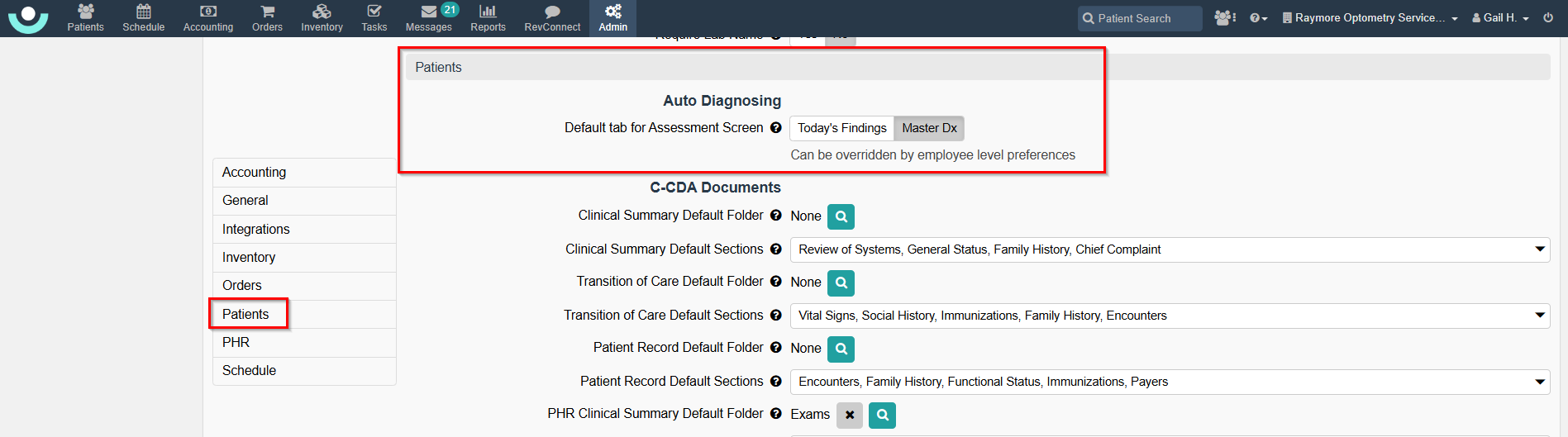- Click either Today's Findings or Master Dx for "Default tab for Assessment Screen." See Example