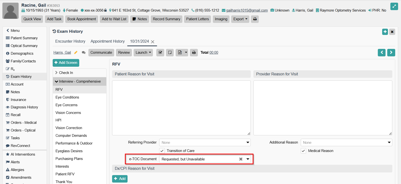 When an inbound referral of an established patient is taking place, the user should check the “Transition of Care” box on the RFV screen. In these situations, it is incumbent on the requesting provider to send you an electronic summary of care document.