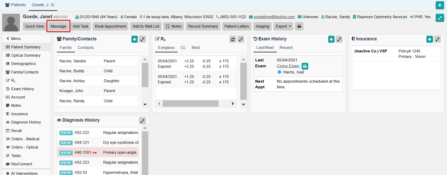 To message a patient, the provider needs to click the Message button within the patient's file. Note: The Message button does not display if the patient is not setup for access to RevolutionPHR. See Example