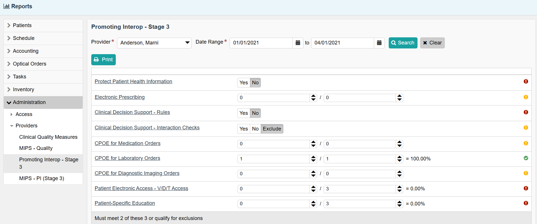 In addition to PI measures, you will also report clinical quality measure (CQM) data for six measures for at least 90 consecutive days (regardless of when you first participated in your state's program). The CQMs are tracked automatically by RevolutionEHR. While statistical performance on these measures is not important for PI success (i.e. there are no thresholds to meet), it can be involved in scoring determinations for other programs such as the Merit-based Incentive Payment System (MIPS).