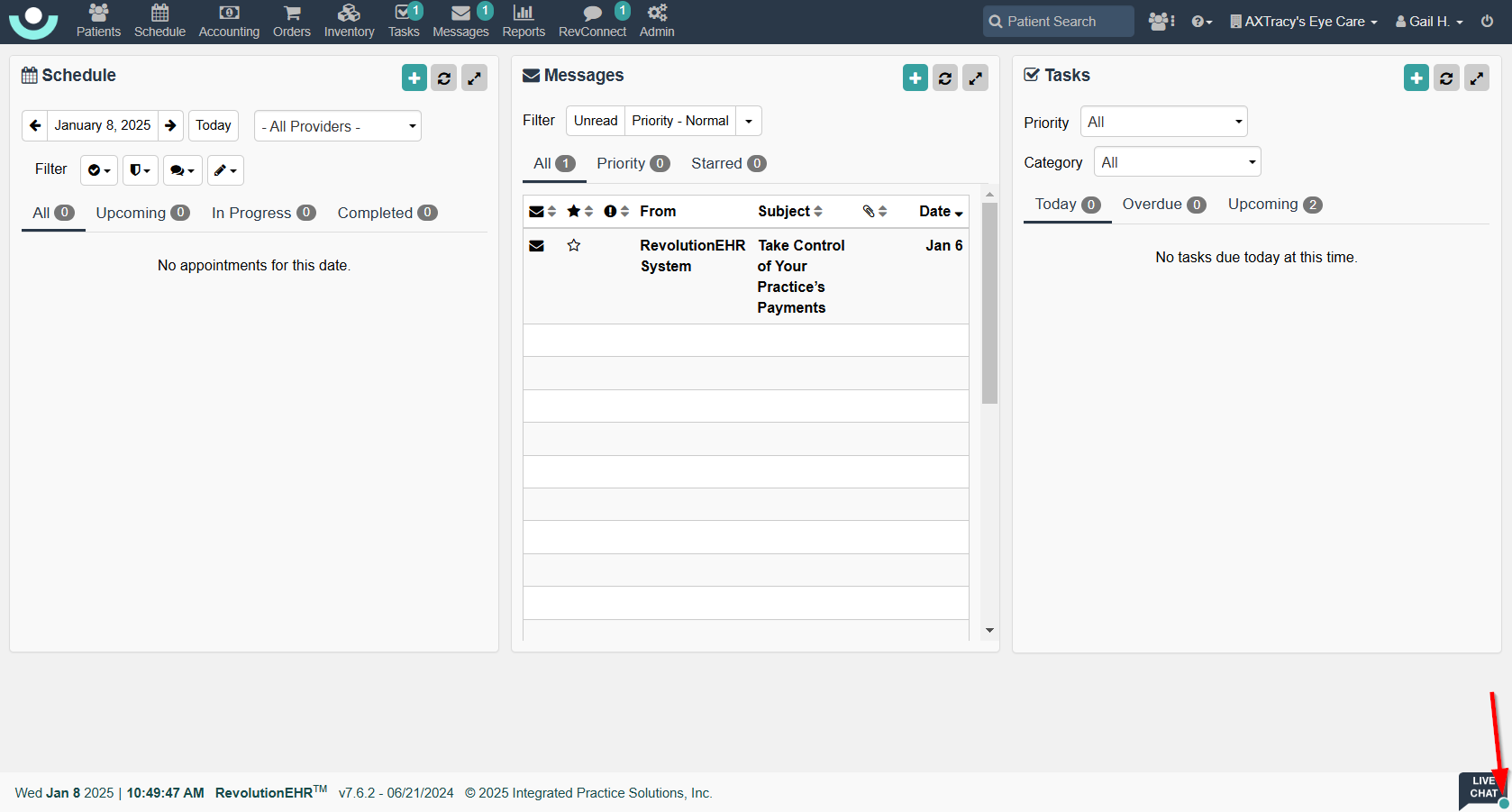 - Available when logged into RevolutionEHR, locate the Live Chat icon in the bottom right corner.