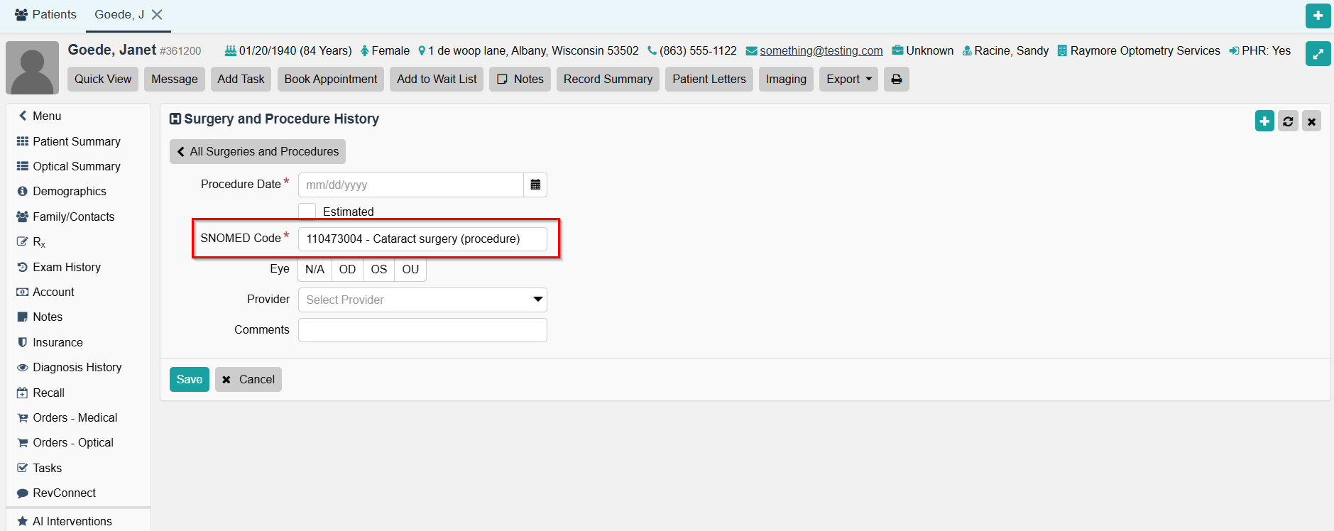 - Cataract surgery is a surgery with SNOMED code from Appendix D logged in Surgery History: See Example