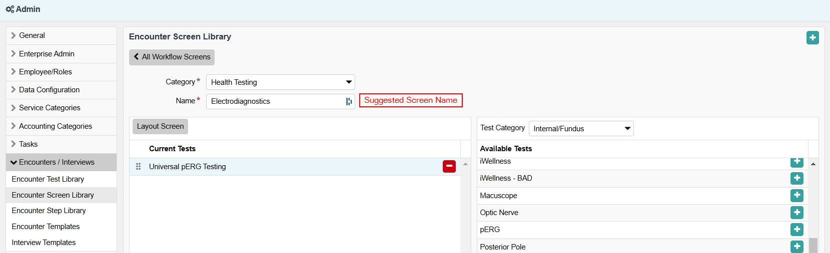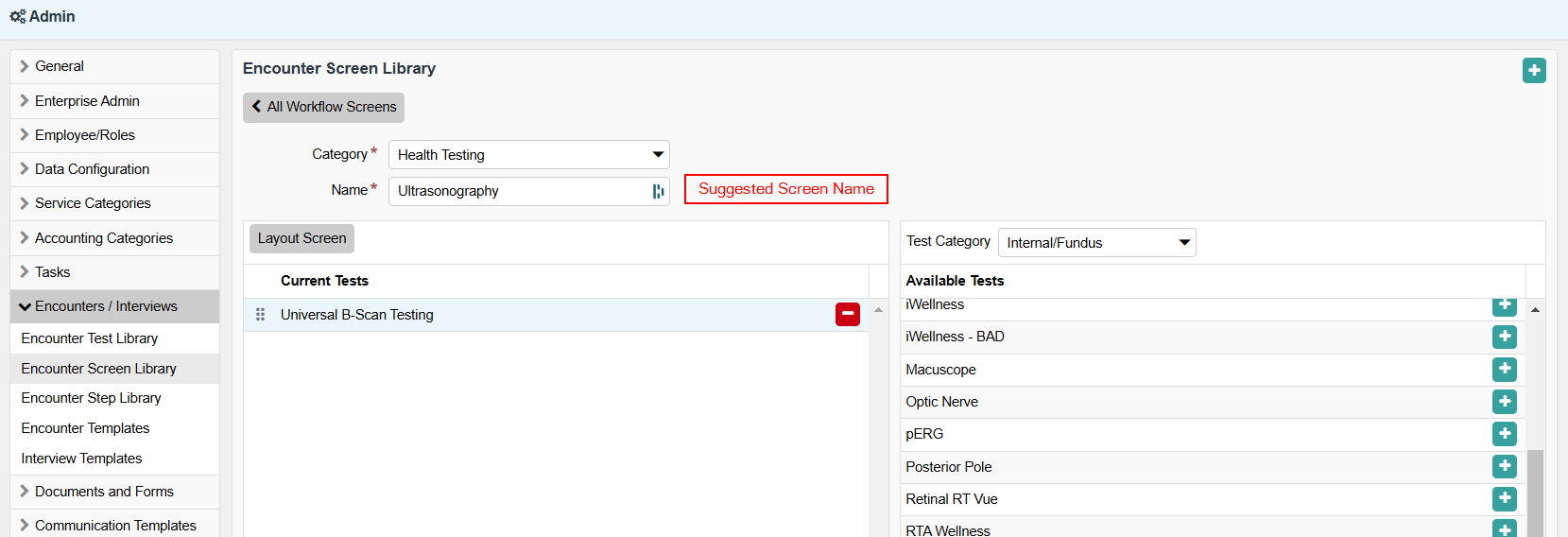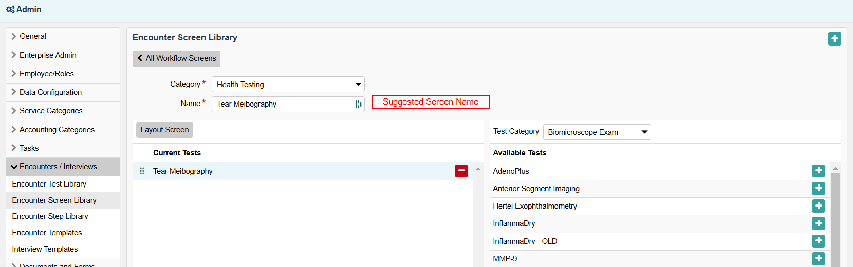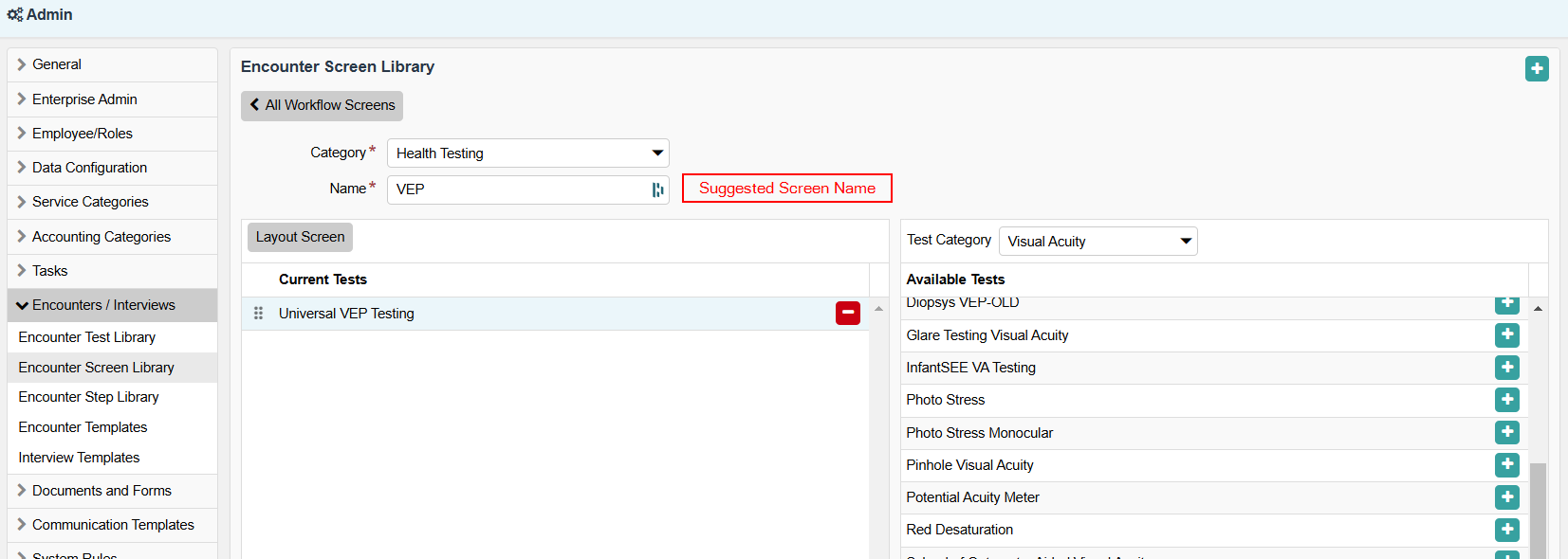 - Access Admin > Encounters / Interviews > Encounter Screen Library > Health Testing.