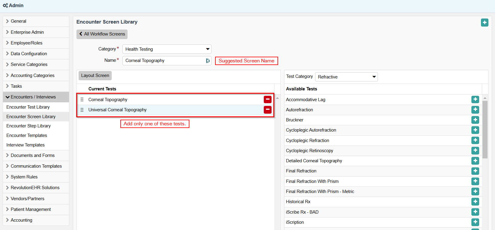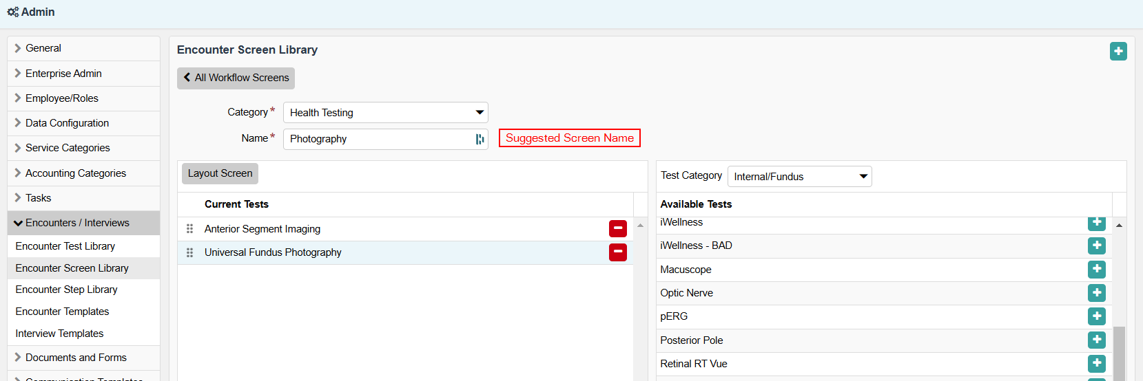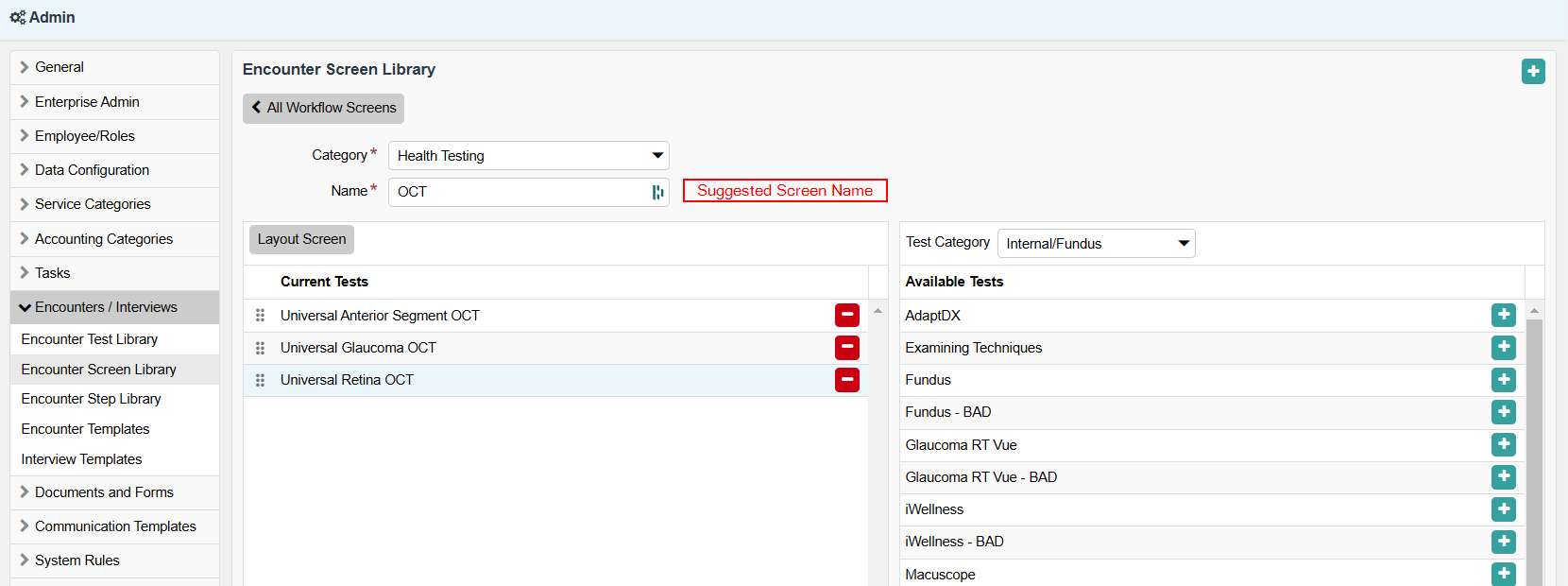 - Access Admin > Encounters / Interviews > Encounter Screen Library > Health Testing.