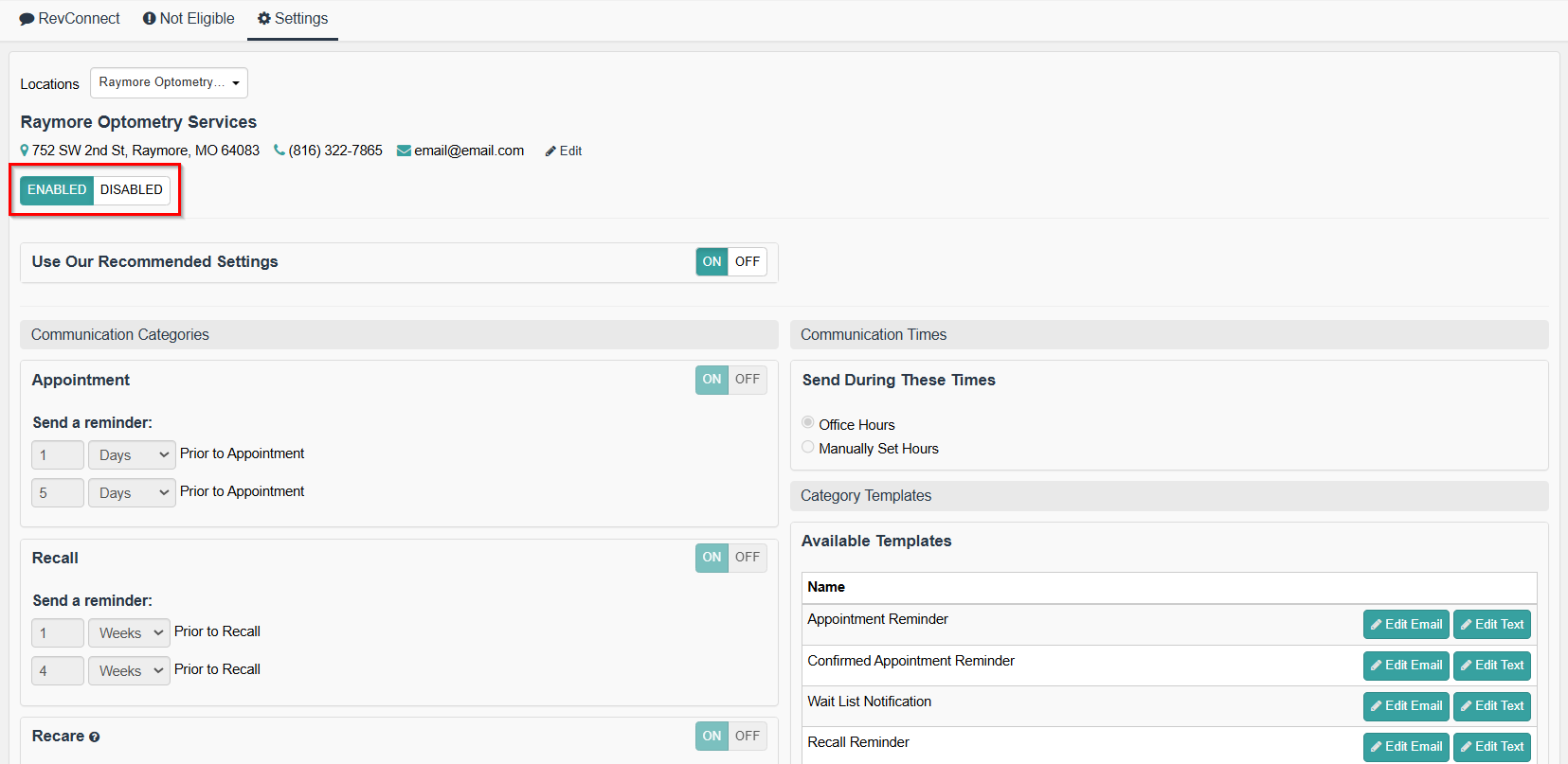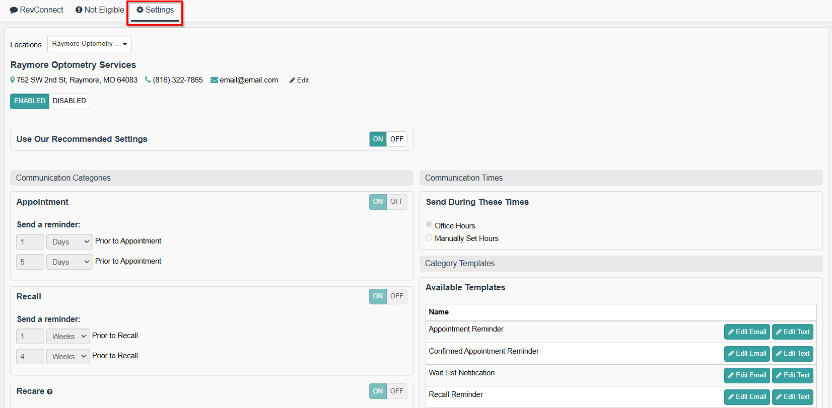 RevConnect settings are designed to be location specific. Each location determines what type of automated messages should be created and sent, the time frame messages should be sent, and message template options. For most offices, our recommended settings will meet the practice's needs and allows a practice to get up and running quickly.
