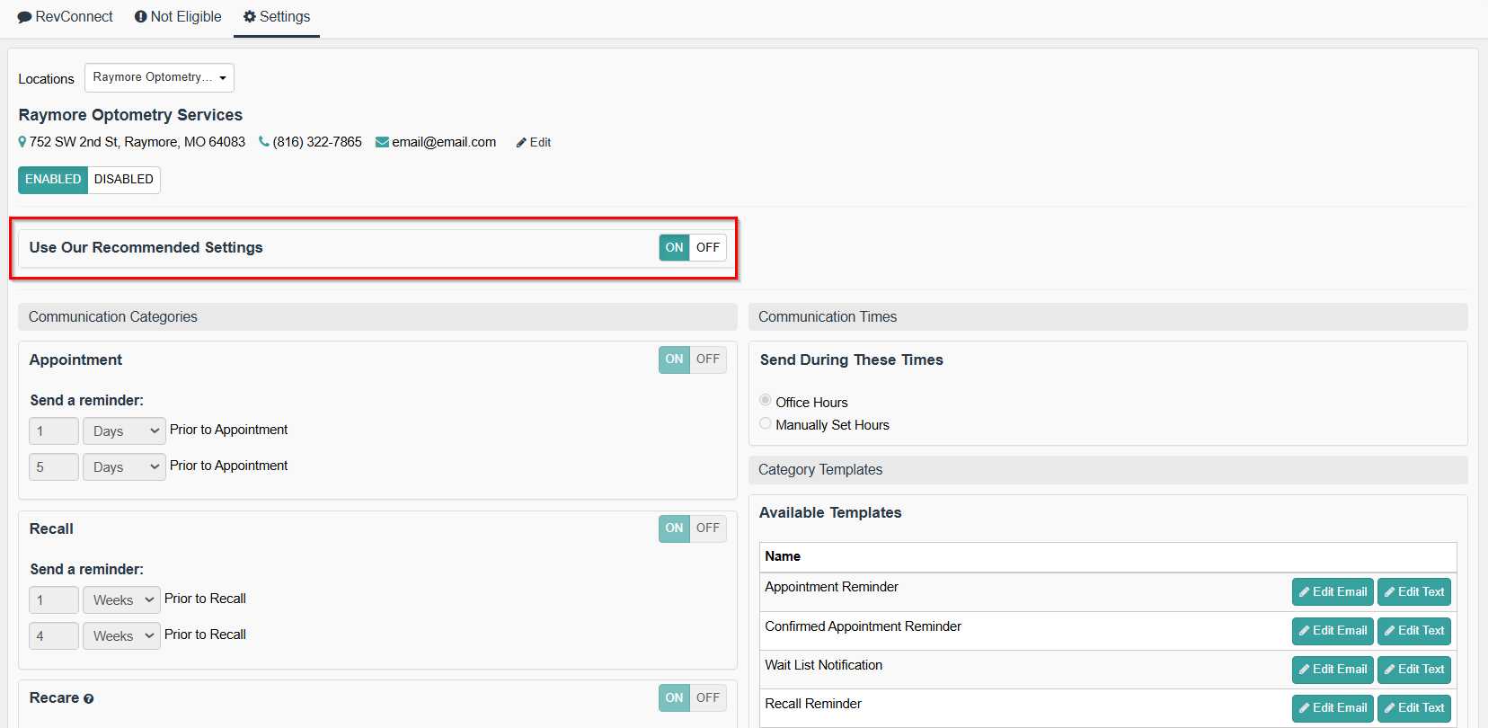 RevolutionEHR has configured Recommended Settings for Communication Categories and Communication Times. Click 'ON' to use the recommended settings, or, click 'OFF' to customize RevConnect for your practice. See Example