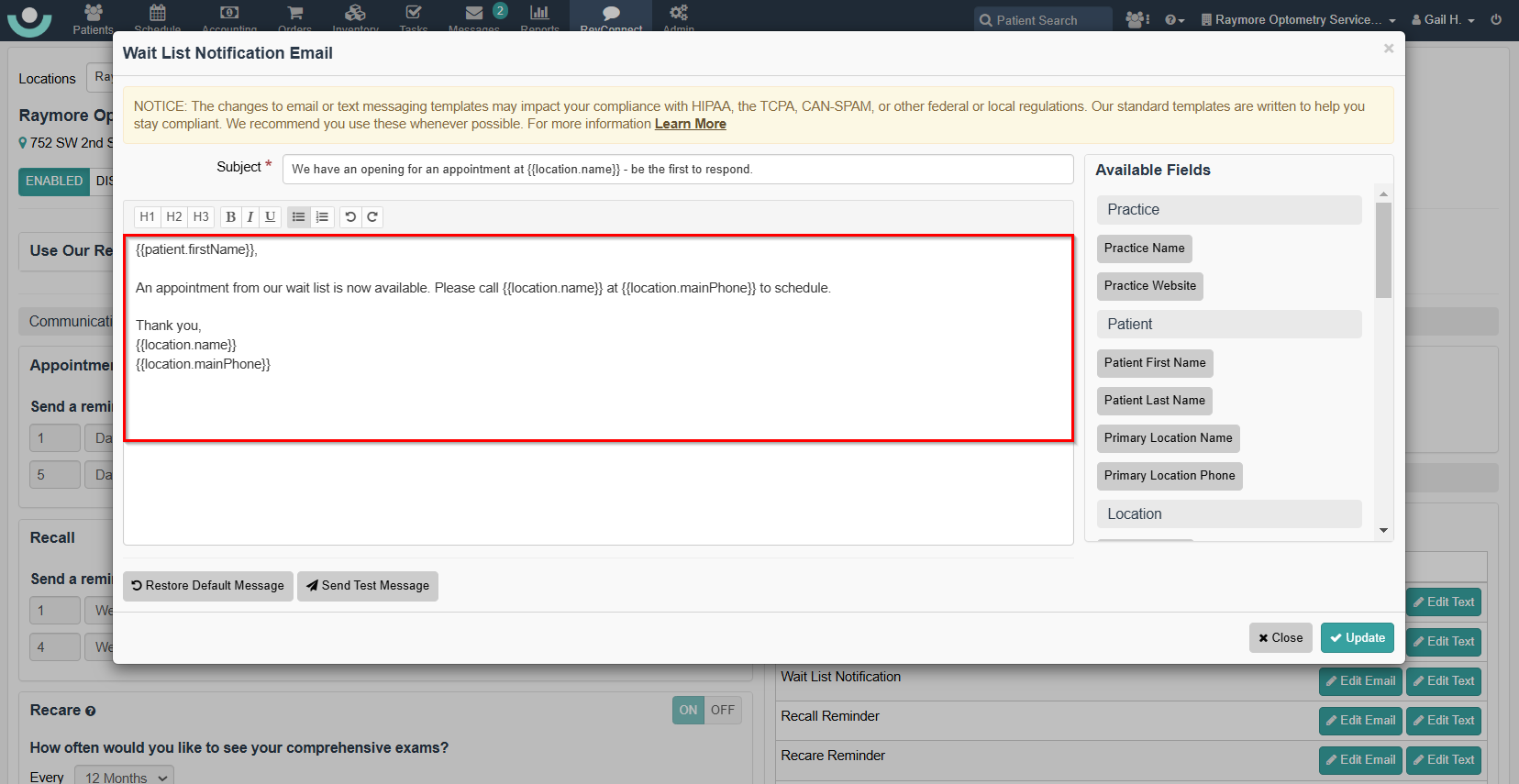 Templates have been created for each type of notification. These templates comply with HIPAA, CAN-SPAM, TCPA, and other federal and local regulations and are written to help you stay compliant. We recommend you use these templates whenever possible.