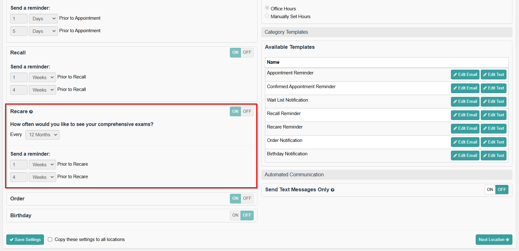 Recare notifications are automatically sent to patients based on the settings configured within "Send a reminder." Within the dropdown menu, indicate how often your practice would like to see comprehensive exams. Input the parameters for the time frame of the Recare notice to be sent. Click 'OFF' to disable this communication category. Click 'X' to delete a reminder.