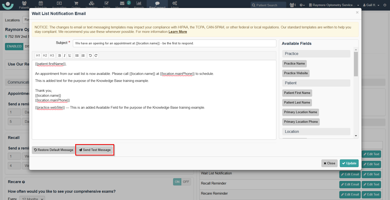 - Although not required, it is highly recommended you click 'Send Test Message.' This action will send you a message within your Messages module. Note: Some message elements are added after the message leaves RevolutionEHR. For a complete picture of your messages, you may want to send yourself the alert via email or text message. See Example