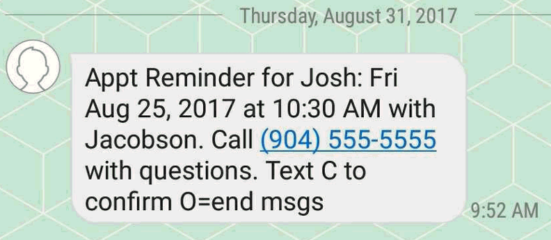 - A text message Appointment Reminder includes instructions to "Text C to confirm O=end msgs. See Example