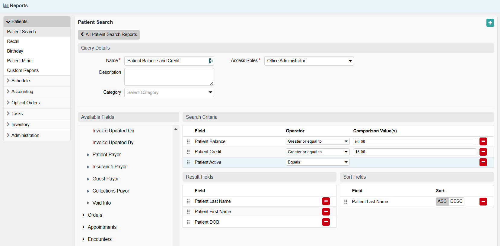 - Drag and drop Available Fields to the Result Fields. (These are the data points that display on your report.)