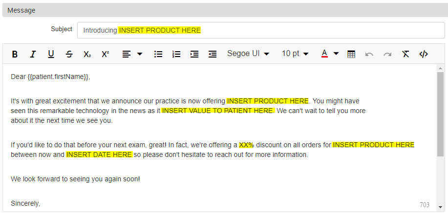 - Dynamic text changes based on the recipient of the message (e.g., patient's first name, patient's provider's last name) .