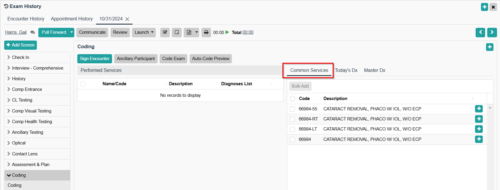- Common Service: Click the checkbox for "Yes, include in common service list." Note: The Common Service Description field can be changed. Common Services display in the Coding screen of an encounter. See Example