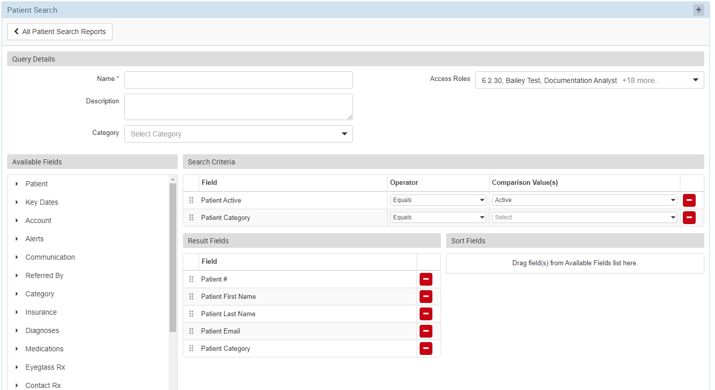 Patients' categories are a way to indicate that a patient falls into a specific category. For example, if you would like to track all patients that are candidates for laser vision correction, a category for "Laser Vision Candidate" can be added and checked within the Quick View of a patient's file. Patients' categories can then be set as a search criteria for a custom report in Patient Search within the Reports module.