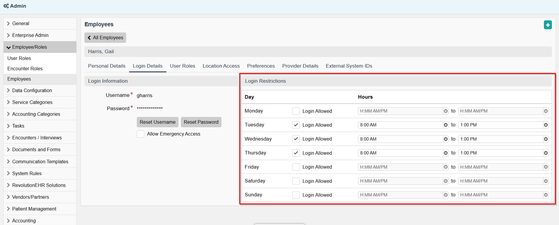 - Login Restrictions: This area allows the practice to restrict the employee's access to RevolutionEHR. e.g., If an employee works T-W-Th, 8a to 1p, their access can be restricted to only those hours. See Example