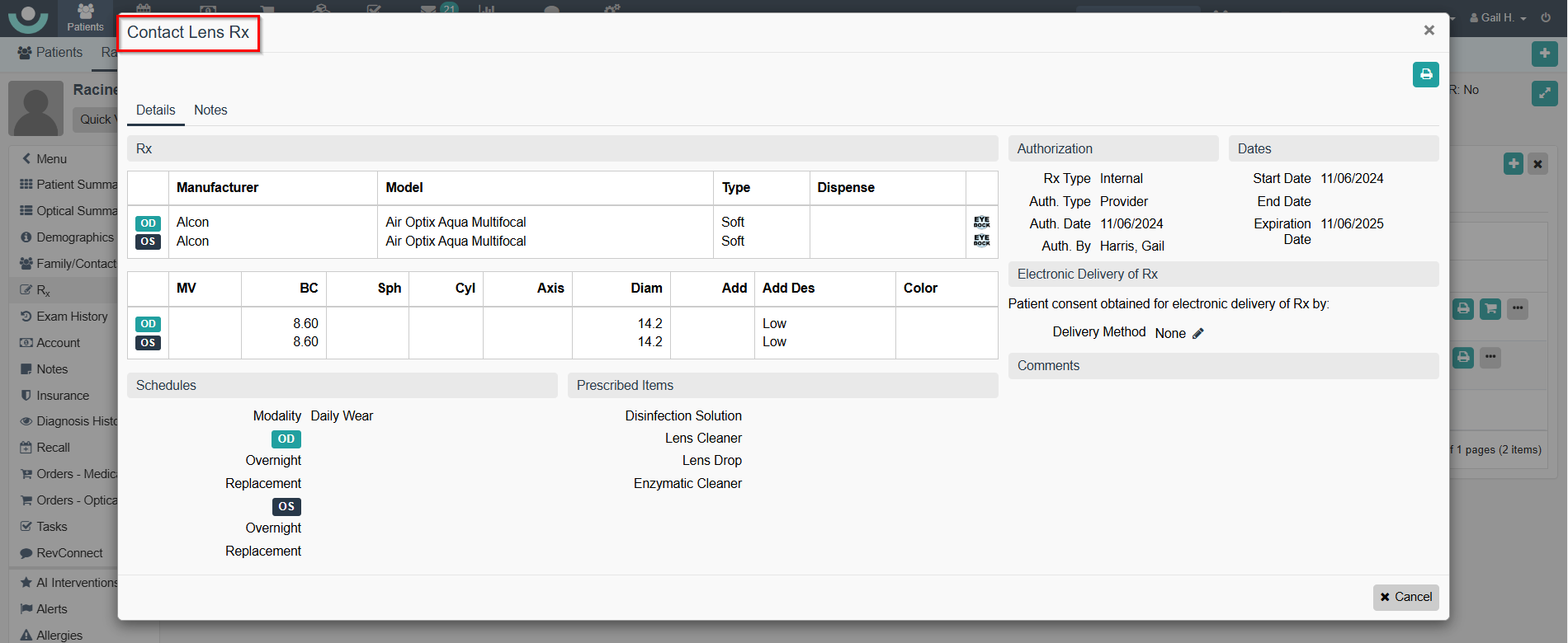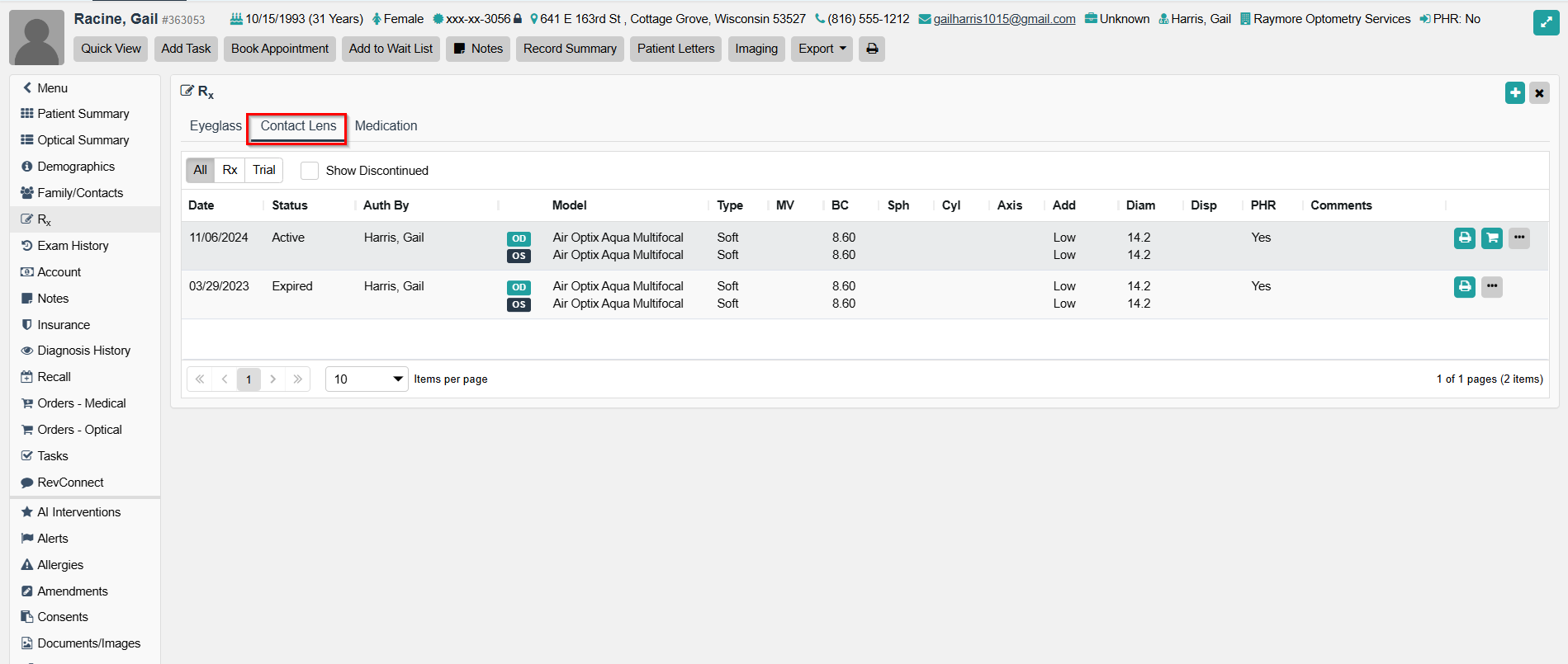 - Within the Rx component of the Patient's File, in the Contact Lens section. See Example