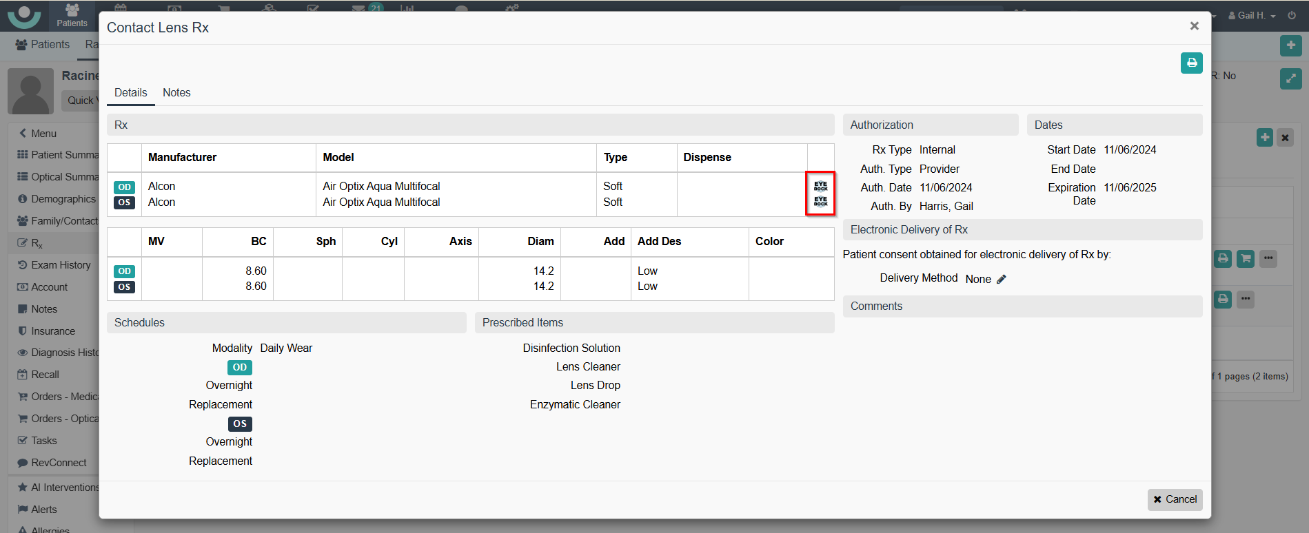- In the Rx section, the EyeDock icon displays. See Example